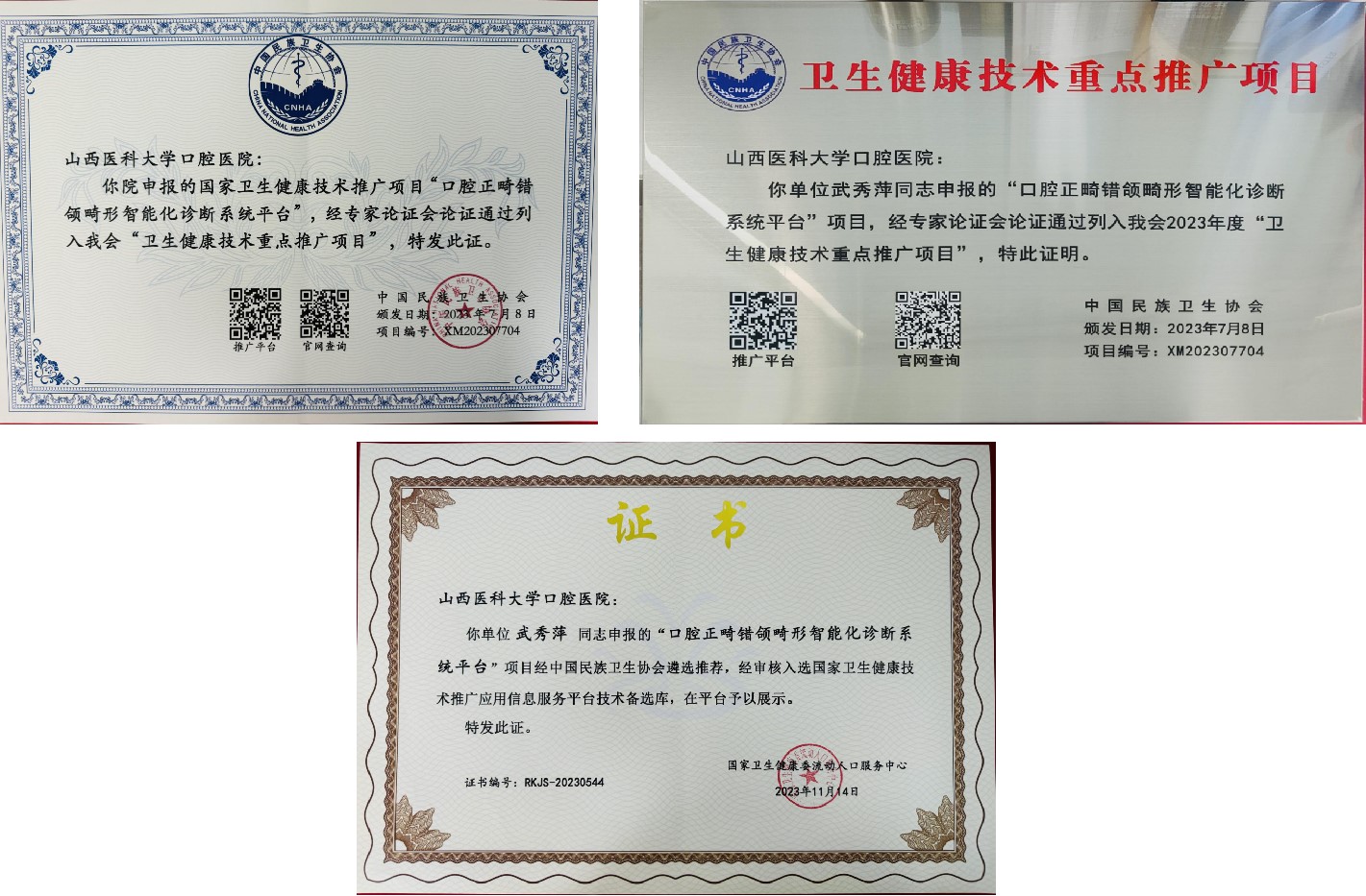 我院正畸科武秀萍教授主持申报的“口腔正畸错颌畸形智能化诊断系统平台”国家卫生健康技术推广项目,于2023年7月列入中国民族卫生协会“卫生健康技术重点推广项目”,同年11月入选国家卫生健康技术推广应用信息服务平台技术备选库,并在平台予以展示。