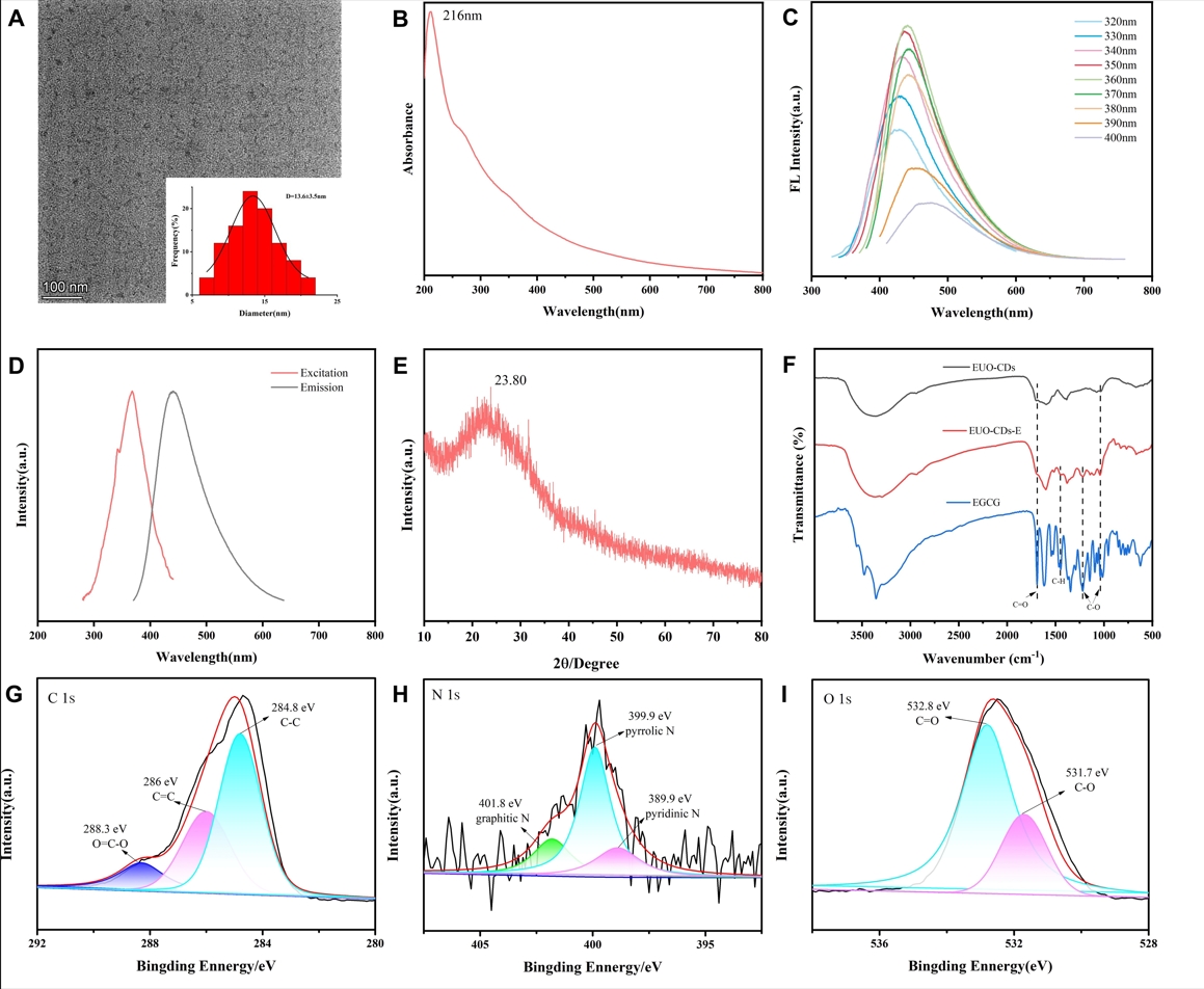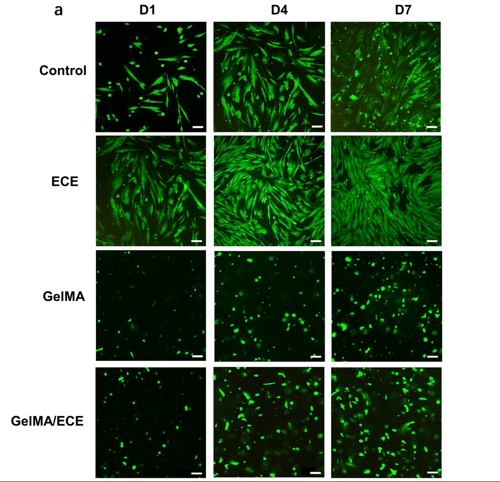 武秀萍教授团队以中药杜仲为碳源合成的具有促成骨作用的杜仲碳点EUO-CDs与具有抗炎、促血管生成功能的表没食子儿茶素没食子酸酯(EGCG)结合,组装成一种新型纳米材料EUO-CDs-E(ECE),研究其体外细胞毒性,确定了ECE的最适宜浓度为100 µg/mL,并以可注射、可光交联的甲基丙烯酰化明胶(GelMA)作为生物支架材料,制备了GelMA/ECE新型水凝胶,对该水凝胶进行理化特性的表征研究,并通过体内外实验证明了该水凝胶具有良好的生物相容性和促进牙髓-牙本质复合体再生的潜能,为其在牙髓再生领域的进一步应用提供理论基础。
