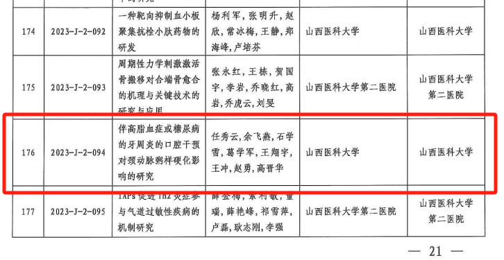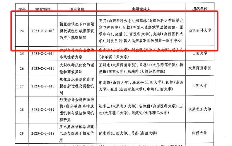 近日,山西省人民政府发布了《关于2023年度山西省科学技术奖励的决定》(晋政函〔2024〕44号),对促进我省科学技术进步和经济社会发展作出突出贡献的科学技术人员和组织给予奖励。我院任秀云教授团队申报的“伴高脂血症或糖尿病的牙周炎的口腔干预对颈动脉粥样硬化影响的研究”获得山西省科学技术进步奖二等奖,王兴教授团队申报的“糖尿病状态下口腔颌面软硬组织缺损修复的应用基础研究”项目获得山西省自然科学二等奖。