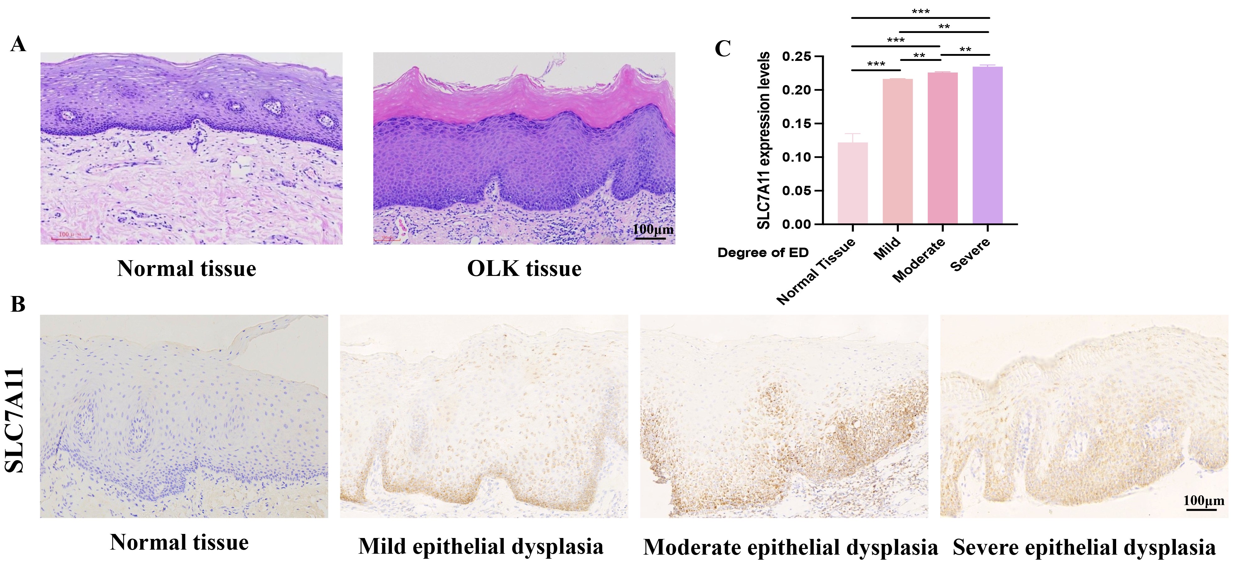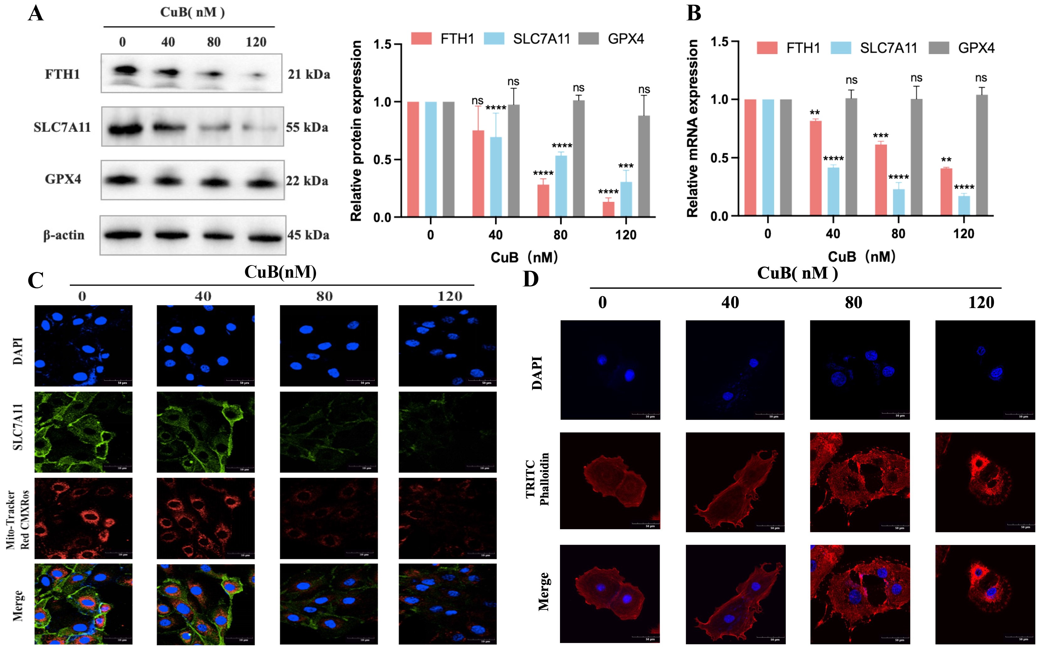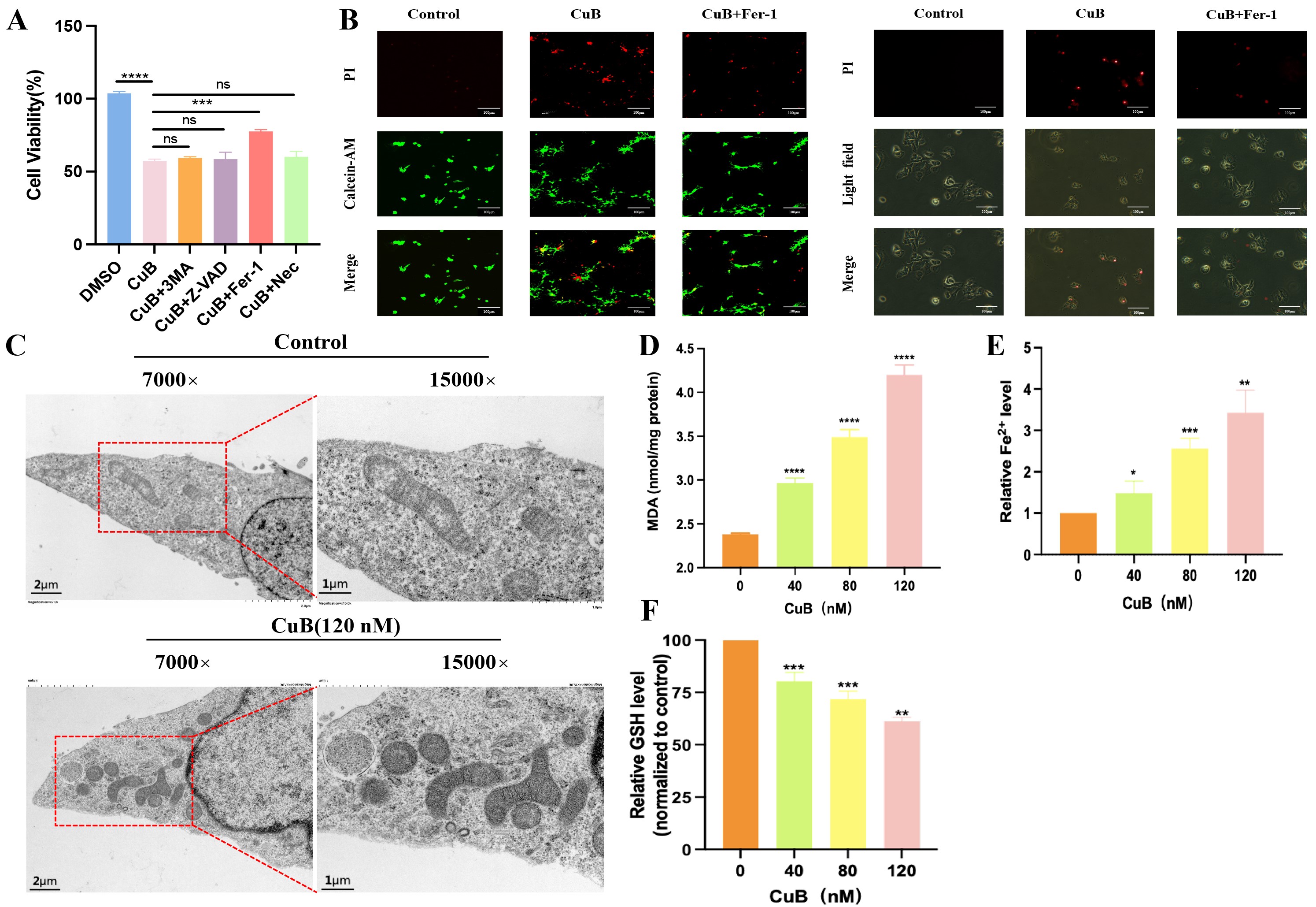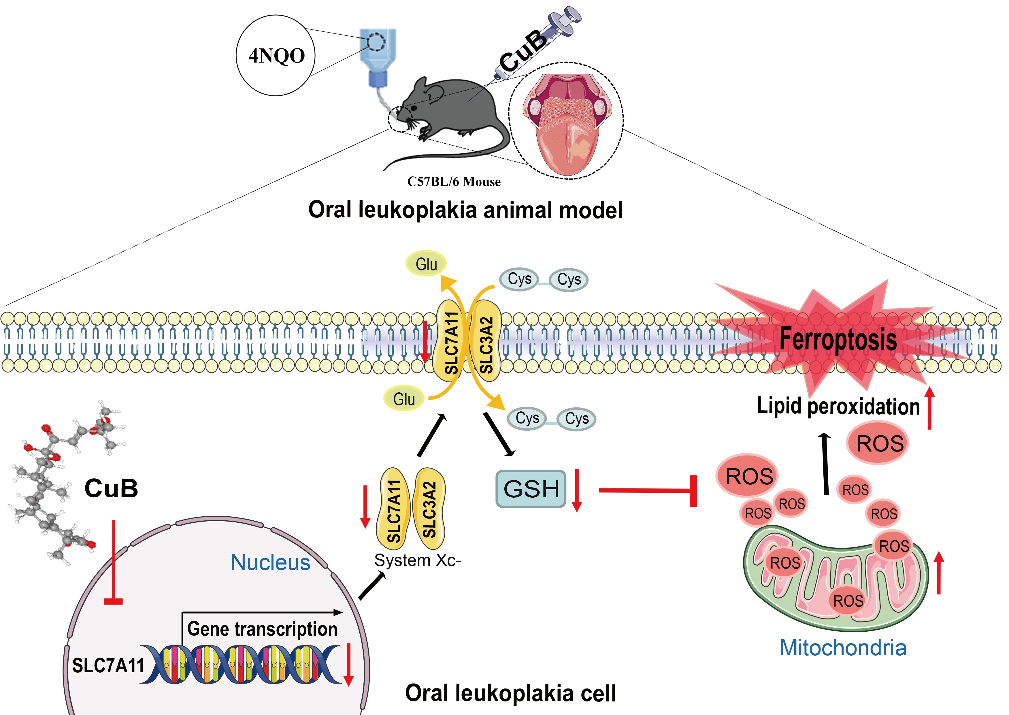 张芳教授团队通过体外实验证明了CuB可能通过下调SLC7A11的表达从而激活铁死亡的发生,具体表现为升高ROS、MDA、Fe2+,下调GSH。体内实验证明,CuB通过激活SLC7A11/线粒体氧化应激通路诱导铁死亡,有效抑制OLK的恶性进展,为CuB未来用于OLK临床药物的开发提供理论基础和科学依据。