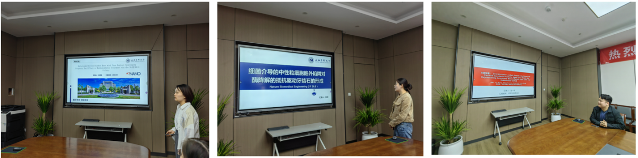 学术汇报环节,师生们聚焦前沿,多维度探讨口腔医学热点。米雁翎博士以《褪黑素衍生碳点通过Nrf2/HO1途径清除氧自由基有效治疗牙周炎》为题,系统介绍了碳点在牙周炎治疗中的研究成果。汇报围绕实验对照组设计、给药方式优化、碳点制备工艺及活性氧(ROS)调节机制展开深入讨论,为牙周病微创治疗提供了新材料思路。张妍博士展示了《细菌介导的中性粒细胞胞外陷阱对酶降解的抵抗驱动牙结石的形成》,会议讨论了牙结石形成机制、治疗方式,分析其结论、用药及实验取材等方面的问题。赵一帆博士则带来《负载虫草素的牙髓干细胞衍生外泌体促进衰老骨修复》,阐述了外泌体载药系统的创新设计及其在骨再生中的应用价值,引发了关于干细胞技术转化的热烈讨论。