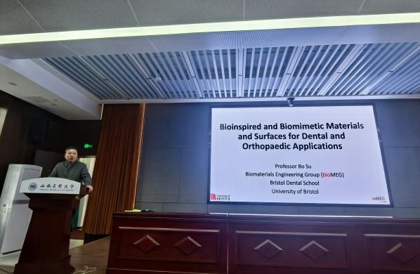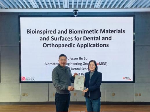 为精准对接临床诊疗需求,推动口腔材料领域技术创新与成果转化,1月9日,我院特邀英国布里斯托大学生物材料学教授、牙科学院生物工程材料研究组负责人苏波来院进行学术交流,并作题为“牙科应用前沿仿生材料与表面设计”的专题讲座。院党委书记任秀云教授出席活动,讲座由副院长王兴教授主持。