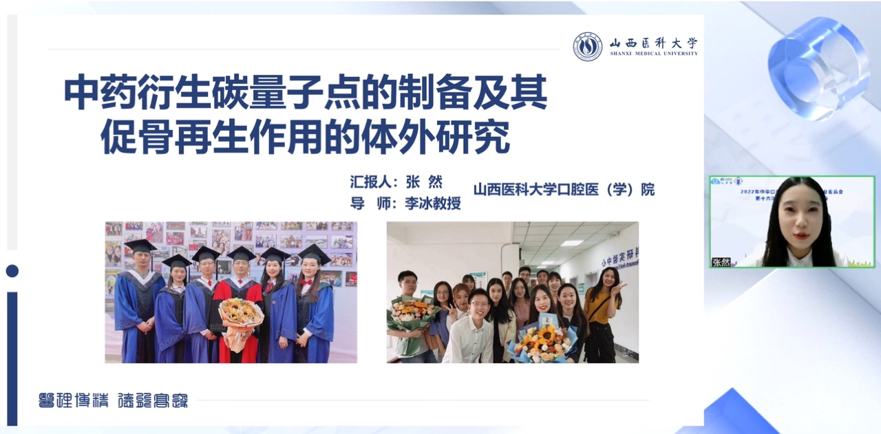 会上,张然同学代表课题组作了题为“中药衍生碳量子点的制备及其促骨再生作用的体外研究”的学术交流。该汇报内容是李冰教授课题组获得的最新研究成果,为骨缺损修复提供了一种新的诊疗思路,受到了与会专家的好评。