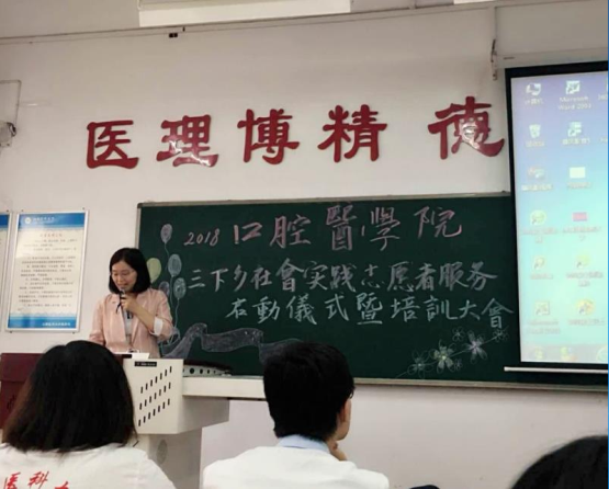 活动前期,口腔医学院于7月10日下午在学校中都校区慎思楼A座举办了2018年暑期“三下乡”社会实践志愿者服务启动仪式暨培训大会。口腔医学院(口腔医院)党委书记任秀云出席并告诫同学们要以安全为前提,利用这次机会锻炼自我,在实践中成才,在服务中成长,体现当代大学生的自身价值。
