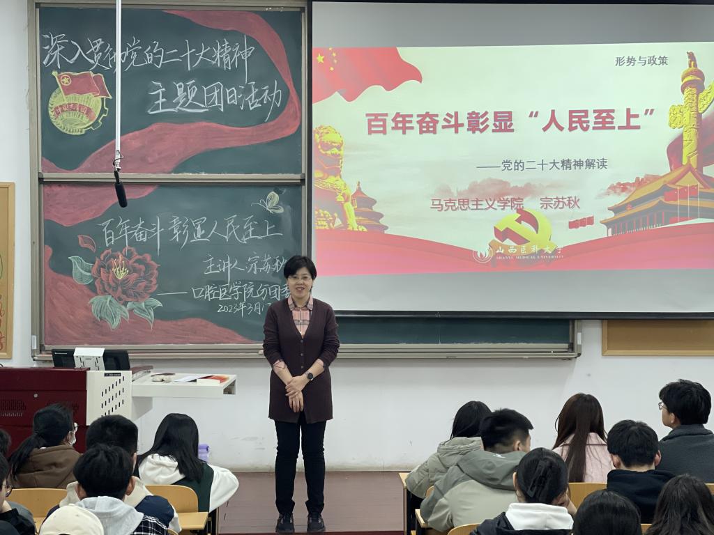 2023年是学习宣传贯彻党的二十大精神的开局之年。为扎实推动党的二十大精神进校园,引导青年学生自觉把思想和行动统一到党的二十大精神上来,3月17日,我院分团委在中都校区至善C座104教室组织开展学习贯彻党的二十大精神主题团日活动。活动特邀校级思政课骨干教师宣讲团成员、马克思主义学院宗苏秋老师,以“百年奋斗彰显人民至上”为题进行宣讲。我院100余名本科生参加活动。