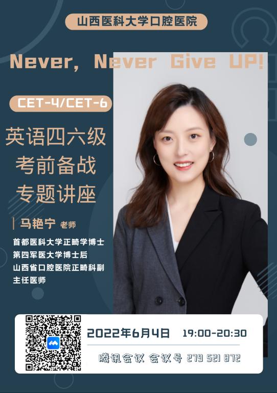 为加强我院学生建设,同时迎接即将到来的英语四六级考试,万象城allwincity官网口腔医学院分团委于6月4日晚七点举办了“CET4/CET6考前备战专题讲座”,本次讲座由贺飙同学主持,邀请到了首都医科大学正畸学博士、第四军医大学博士后、山西省口腔医院正畸科副主任医师马艳宁老师分享经验心得。