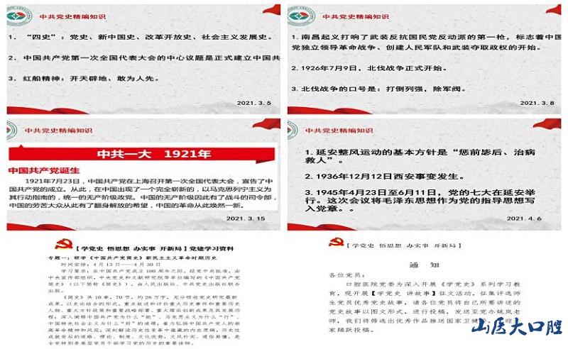 3月8日,院党委书记任秀云以“抗疫斗争彰显中国共产党和中国特色社会主义制度的显著政治优势”为题,开展党史主题“开学第一课”教育活动,为我院2017级93名本科生带来生动的党史教育课和思想政治课。通过专题党课,强化思想引领,培养学生干事创业勇气和以祖国强盛为己任的胸怀,把学习教育成果转化为爱国报国的实际行动。同学们纷纷表示,党史学习是每一名时代大学生的必修课,要将党史学习作为成长成才的精神滋养,牢记使命、砥砺奋进,努力成长为合格的建设者和接班人。在第二十六个世界读书日到来之际,我院组织本科生开展了以“学党史,读经典”为主题的读书分享会,丰富学生的精神世界,让学生感受国家发展辉煌成就。同学们纷纷表示,读书分享会使他们在轻松愉快的氛围中重温了党的历史,交流了学习收获,激励同学们互相学习、携手前行,努力做德医双馨的人民好医生。5月4日,我院组织2016级本科生线上观看金一南教授以“我们的时代,我们的奋斗”为题的震撼演讲,学生们感触颇深,在这个百年变局的时代,唯有做有心人,才能在学习的道路上稳步迈进。5月9日,我院分团委学生会举办了以“重温红色记忆,厚植爱国情怀”为主题的宿舍小报大赛,通过融入华表、党徽、天安门等爱国元素,激发了全体学生对建设祖国的无限热情。