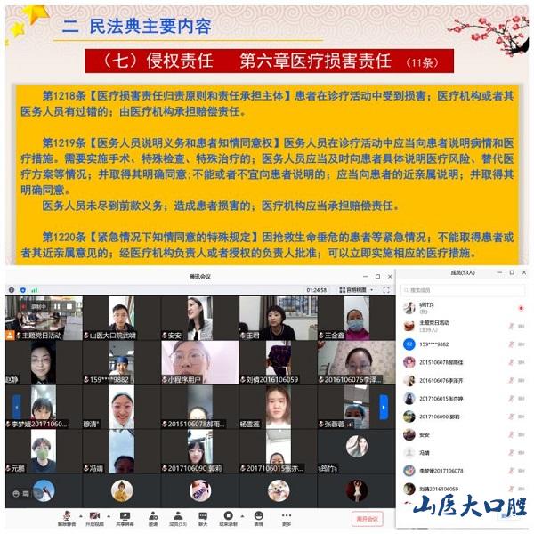 任秀云书记从我国民法典的编纂历程、内容结构、基本特征、解决的问题及重大意义五个方面,带领师生党员对民法典进行了初步了解学习。她指出,《中华人民共和国民法典》是新中国成立以来第一部以“法典”命名的法律,是一部固根本、稳预期、利长远的基础性法律,集中体现了中国特色社会主义法律制度成果和制度自信、文化自信,被誉为“新时代人民权利宣言书”和“社会生活的百科全书”。任书记主要以民法典主要内容中第七编之侵权责任为切入点,初步解读了医疗损害责任的条款规定,强调了医患沟通、患者知情同意权、医疗机构妥善保管病历资料的重要性,提出了避免医患矛盾纠纷的措施。