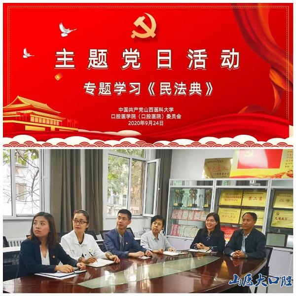 9月24日下午,我院在科教楼第一会议室开展主题党日活动,专题学习《中华人民共和国民法典》。赵彬院长、教工支部书记、党委办公室人员线下参会,全体教工和学生党员通过“腾讯会议”手机端、电脑端线上收看,实现了“线上+线下”共同学习,会议由党委书记任秀云主持。