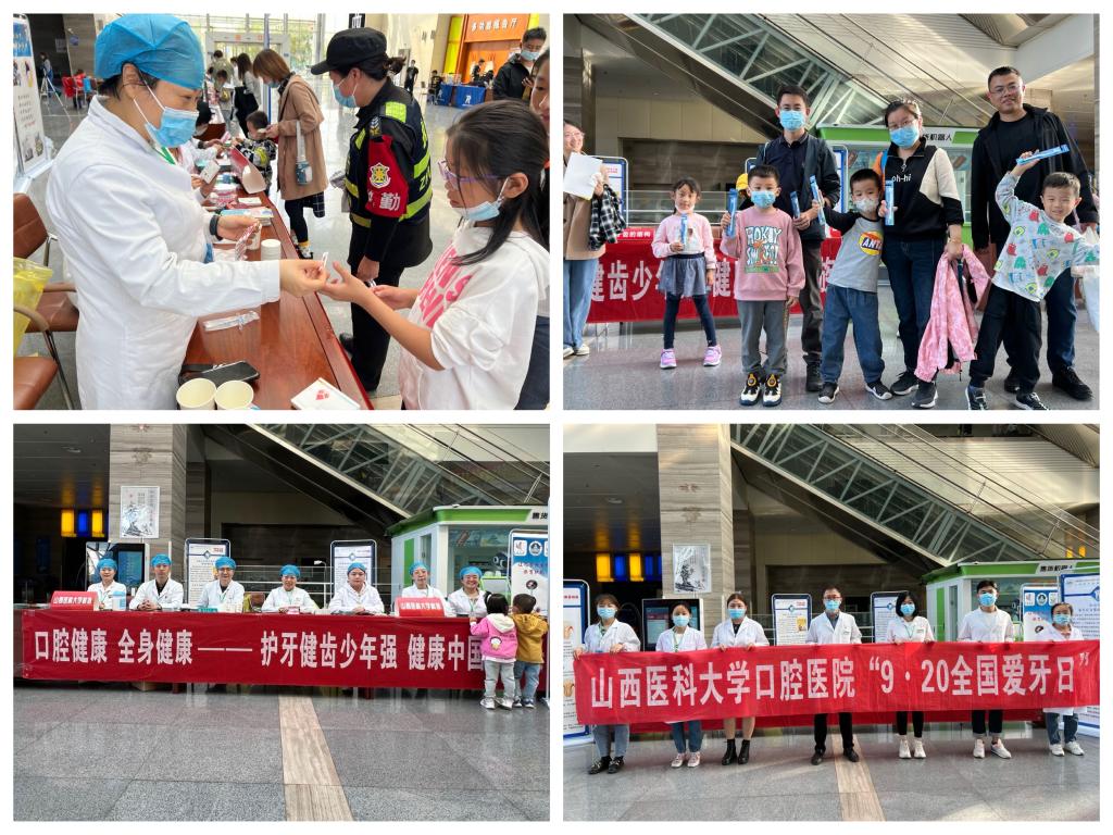 2022年9月20日是第34个“全国爱牙日”,本届爱牙日的主题是“口腔健康,全身健康”,副主题为“护牙健齿少年强,健康中国民族兴”。为深入贯彻落实《健康中国行动(2019-2030年》《健康口腔行动方案(2019-2025年)》有关要求,我院在国家卫生健康委国际合作交流中心和中国牙病防治基金会的指导下,联合中国康复医学会、山西省科学技术协会、太原市总工会、山西省全国儿童口腔疾病综合干预项目单位,共同开启“9·20全国爱牙日”系列活动。此次活动以覆盖全生命周期口腔保健为出发点,以实现全民口腔健康预防为落脚点,以线上线下相结合的模式进行,线上板块主要指“口腔健康惠民众”,线下板块包含“口腔健康下基层”、“口腔健康送下乡”、“口腔健康促科技”、“口腔健康邀专家”、“口腔健康系患者”五大板块,真正做到将口腔健康知识传播至社区、公园、医院、永和贫困县、科技馆等多个社会场所和地区。