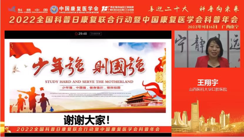 9月16日上午,由中国康复医学会主办的“中国康复医学会全国科普日联合行动暨康复科普年会与科技创新高峰论坛”在南宁召开。本次大会设立南宁主会场与线上云科普大讲堂,同步线上观看人数超7万人。在口腔疾病预防与康复分会场中,我院王翔宇副院长作为山西省首位被遴选登上中国康复医学会科普舞台的演讲嘉宾,作了题为《青少年口腔保健》的科普演讲,详细介绍了青少年口腔健康的常见问题,博得了与会专家的热烈掌声。