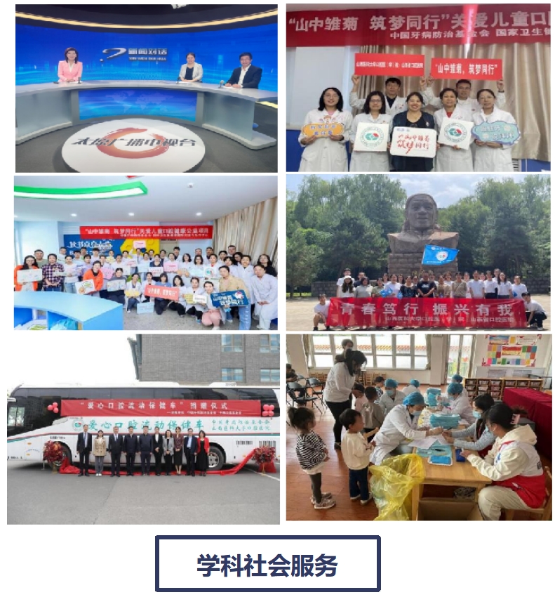 学科坚持以需求为导向,多措并举不断提升社会服务能力和水平。首先,通过各式各样的口腔卫生宣教活动、将服务送至学校课堂、厂矿机关、社区军营和偏远山区,服务辐射覆盖全省11地市、86个项目区县,惠及全生命周期人群500余万人。如“我为群众办实事”等各类活动23场;通过广播、电视、公众号等多方式多渠道,开展“口腔健康惠民众”等36场科普活动;线上“云科普”受益百万人次,从线上到线下,切实履行了社会责任。此外,连续五年参加由国家卫建委和牙病防治基金会联合主办的国家5A级“山中雏菊、筑梦同行”公益慈善项目,为山区儿童进行口腔义诊,在口腔公共卫生服务事业上做出突出贡献,因此受到中国牙病防治基金会嘉奖,赠与价值百万“爱心口腔流动保健车”一辆,为基层群众开展优质暖心的口腔健康服务打通“最后一公里”,开启口腔预防爱心之旅。再者,对适龄儿童进行免费口腔适宜技术的实施,近15年间已为50.456万人完成窝沟封闭牙数166.3585万颗;为10多万儿童完成局部用氟。学科牵头开展了山西省第一次口腔健康流行病学调查,对全省16个县(区)25944人进行了口腔健康检查和问卷调查,《山西省第一次口腔健康流行病学调查报告》被山西省卫健委采纳,建立了山西省特色口腔疾病数据库。数据库的管理需要智慧化,因此,学科与时俱进的成功构建了我省全生命周期人群口腔公共卫生健康管理平台。该平台将学科承担的国家重大公益科研专项,如全国第四次口腔健康流行病学调查、全国重点人群口腔健康状况监测项目;国家重大公共卫生项目,如儿童口腔疾病综合干预项目、口腔健康助成长项目以及山西省重大公共卫生项目,如山西省儿童及青少年口腔常见病和影响因素监测及综合干预项目、山西省老年人口腔疾病综合干预项目等各级各类项目整理融合,通过电子化录入和智能化处理数据,逐步实现针对全人群口腔健康的监测、预防、治疗、维护和知识普及。下一步,我们期待将全身体检大数据加入其中进行整合分析,探索全身疾病与口腔疾病关系,以实现两者互相预测及防控,为政府提供基线数据,更加精准科学推动我省口腔乃至全身健康管理事业高速发展。助力健康中国建设,为社会主义现代化建设繁荣与发展贡献力量。