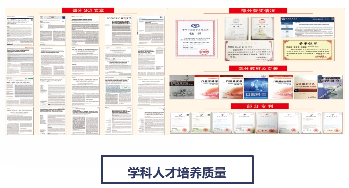 学科严格遵循学科发展和口腔医学人才培养规律,重视培养方案的制定和修订,不断优化培养环节,完善质量控制,紧抓课程学习、实习实践、论文开题、中期考核、论文评审与答辩、学位评定等关键环节,全方位压实培养责任。充分发挥学校研究生教学质量评价系统作用,强化研究生培养全过程质量控制。落实研究生教育质量年度报告制度,实现对研究生教育质量评价的常态化、系统化。建立健全全方位研究生形成性评价体系,明确不同层次、不同类型研究生培养过程的管理环节和考核指标,将平时考核与阶段考核相结合,定性考核与定量考核相结合,校内教学督导与校外专家考核相结合等方式有机运用到研究生考核中。实施淘汰和分流机制,保证研究生培养质量。近年来学科在教学成果方面,取得了显著的成绩:2023年《牙周病学》获批国家一流精品课程,同年获得山西省教学成果奖一等奖1项,二等奖3项,近5年学科已获批省级精品课程6门,教学成果奖11项,这些成果不仅彰显了我们在教学领域的卓越实力,也为口腔医学人才的培养提供了有力支撑。同时,学科支持学生参与科研项目,加强学术合作交流,研究生的科研能力不断提高,近5年学生发表论文341篇,其中以第一作者发表SCI论文102篇;在国家级、省级学术会议中口头汇报20余次,壁报交流100余次,出国留学深造40余人次。