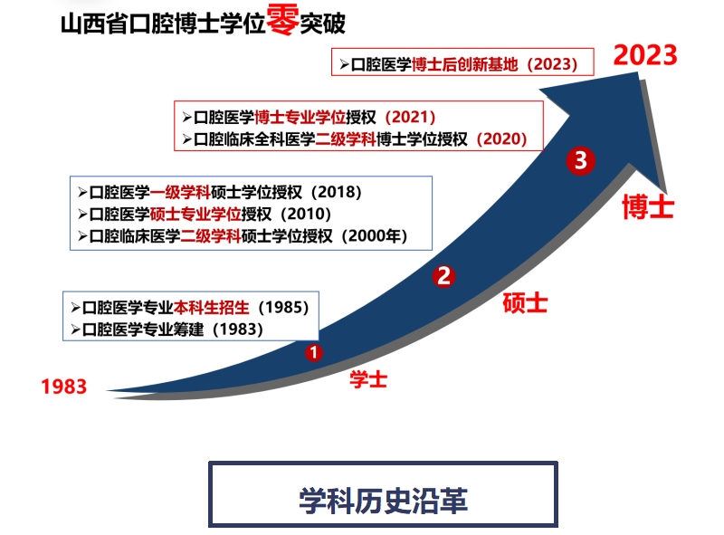 万象城allwincity官网是山西省内唯一的口腔医学硕士、博士学位授权点,是引领山西口腔医学发展的中坚力量。口腔医学学科筹建于1983年,2010年获批口腔医学硕士专业学位授权点,2018年获批一级学科硕士学位授权点,2020年获批口腔临床全科医学二级学科博士学位授权点,2021年获批口腔医学博士专业学位授权点,2023年获批山西省博士后实践创新基地,全票通过口腔医学一级学科硕士学位授权点专项核验。