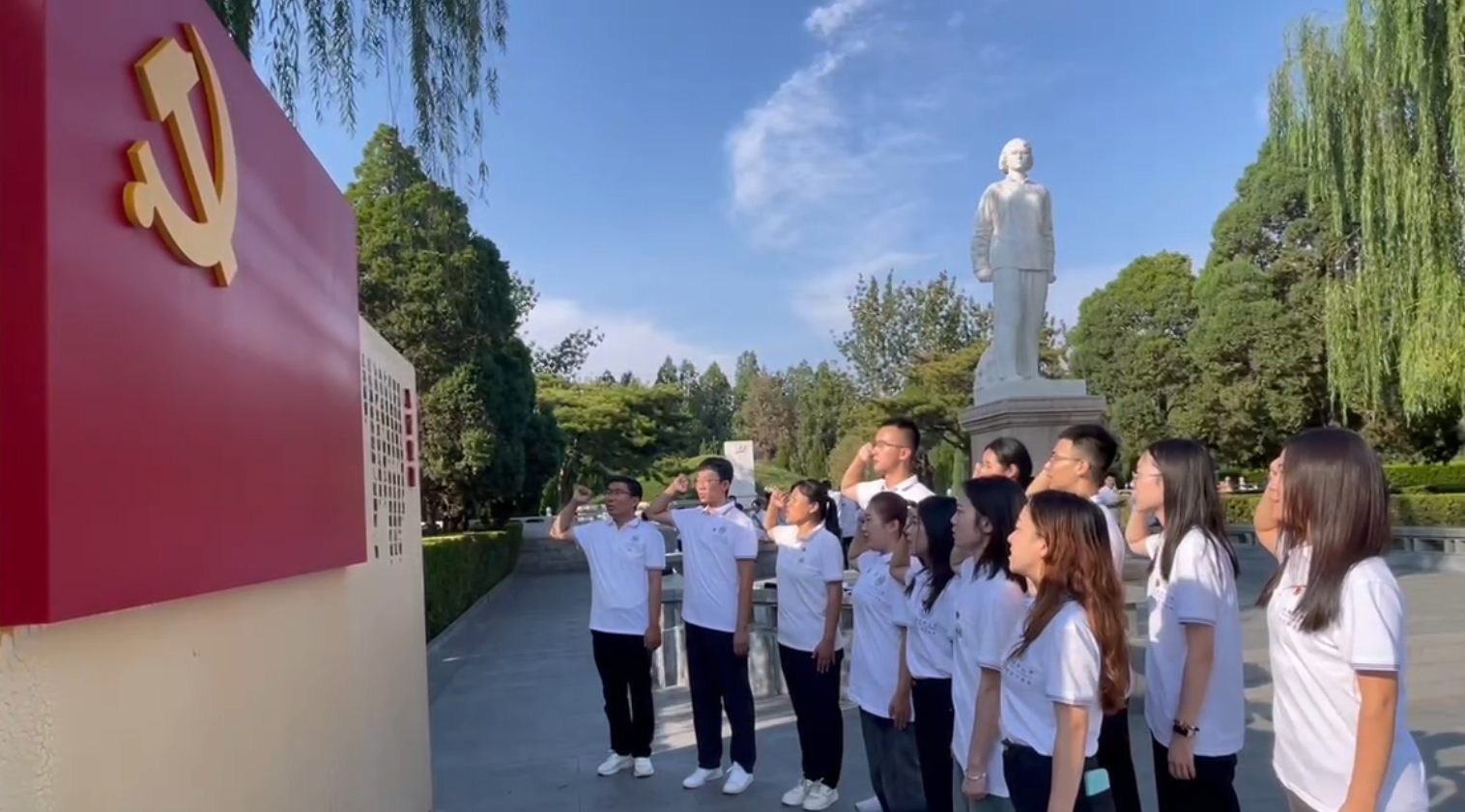 在刘胡兰墓前,全体师生合唱了《国际歌》《理想》两首歌曲,“如果没有人来幻想明天花儿会开放,就不会有人拼尽全力播种下希望。如果没有人来相信明天繁花似海洋,就不会有人跟随跋涉百年的茫茫”,歌曲激荡人心,悠长回响。