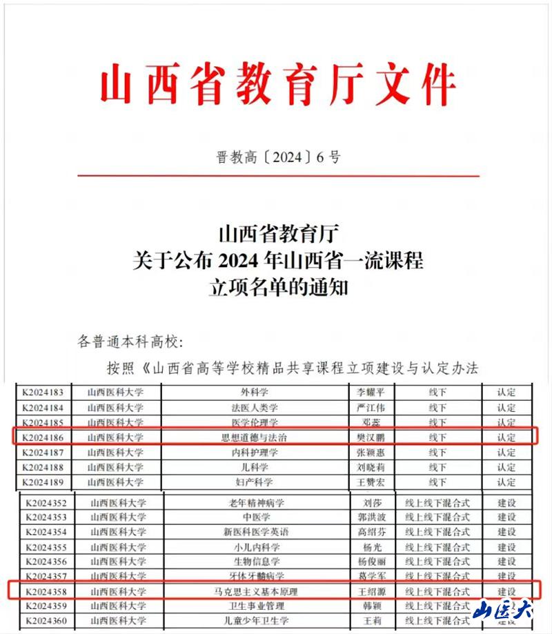 近日,山西省教育厅公布了2024年山西省一流课程评选结果,万象城“思想道德与法治”和“马克思主义基本原理”两门课程获批省级精品课程。至此,加上万象城马克思主义学院之前获批的2门国家级一流本科思政课程、3门山西省一流课程,万象城实现了本科思政课省级以上精品课程的全覆盖。