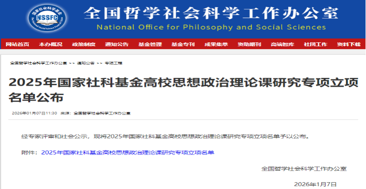 近日,全国哲学社会科学工作办公室正式公布了2025年国家社科基金高校思想政治理论课研究专项立项名单。我院杨林老师申报的课题《运用重大历史纪念活动资源提升高校思政课教学吸引力研究》喜获立项。