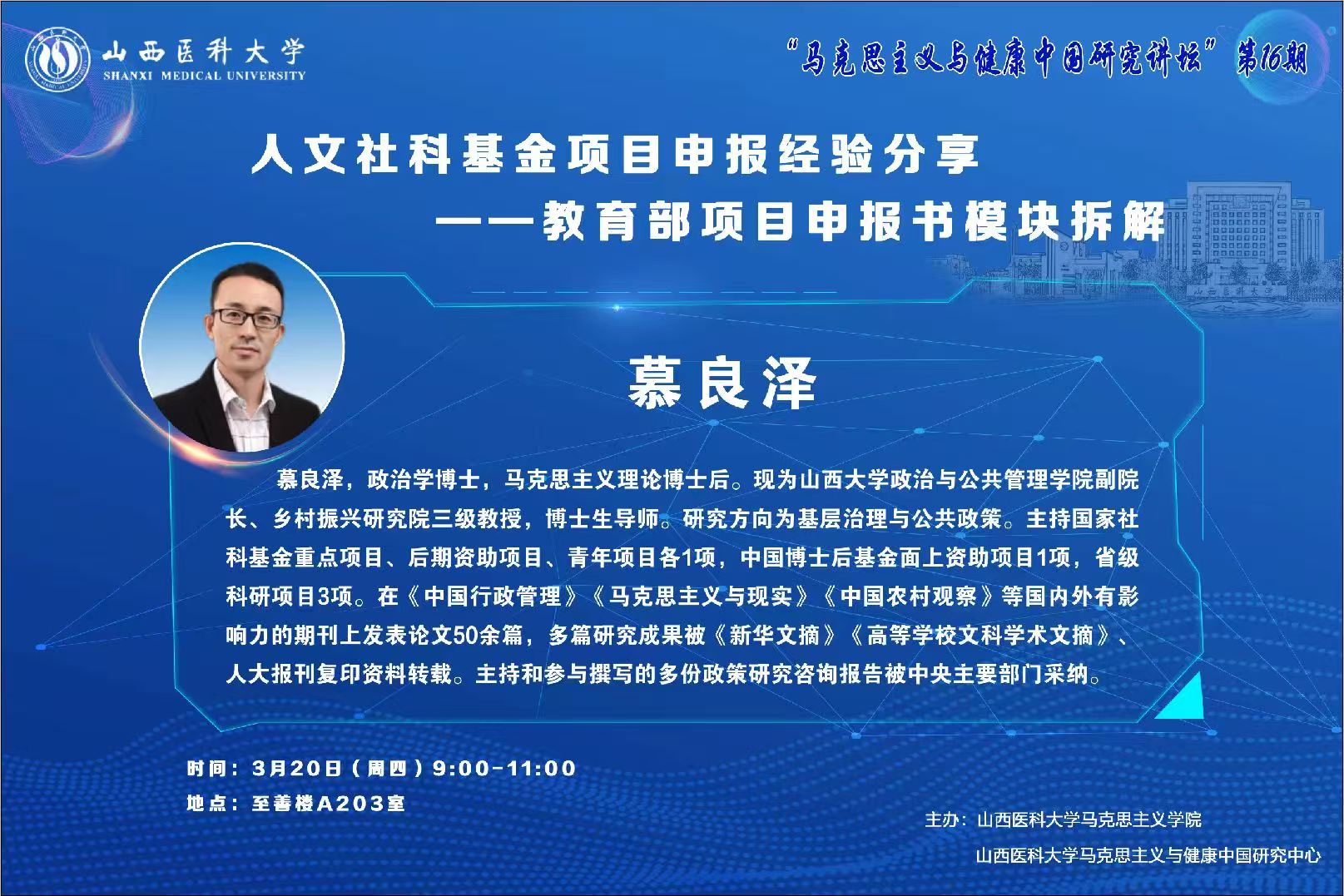 【“马克思主义与健康中国研究讲坛”第16期】慕良泽讲“人文社科基金项目申报经验分享——教育部项目申报书模块拆解”