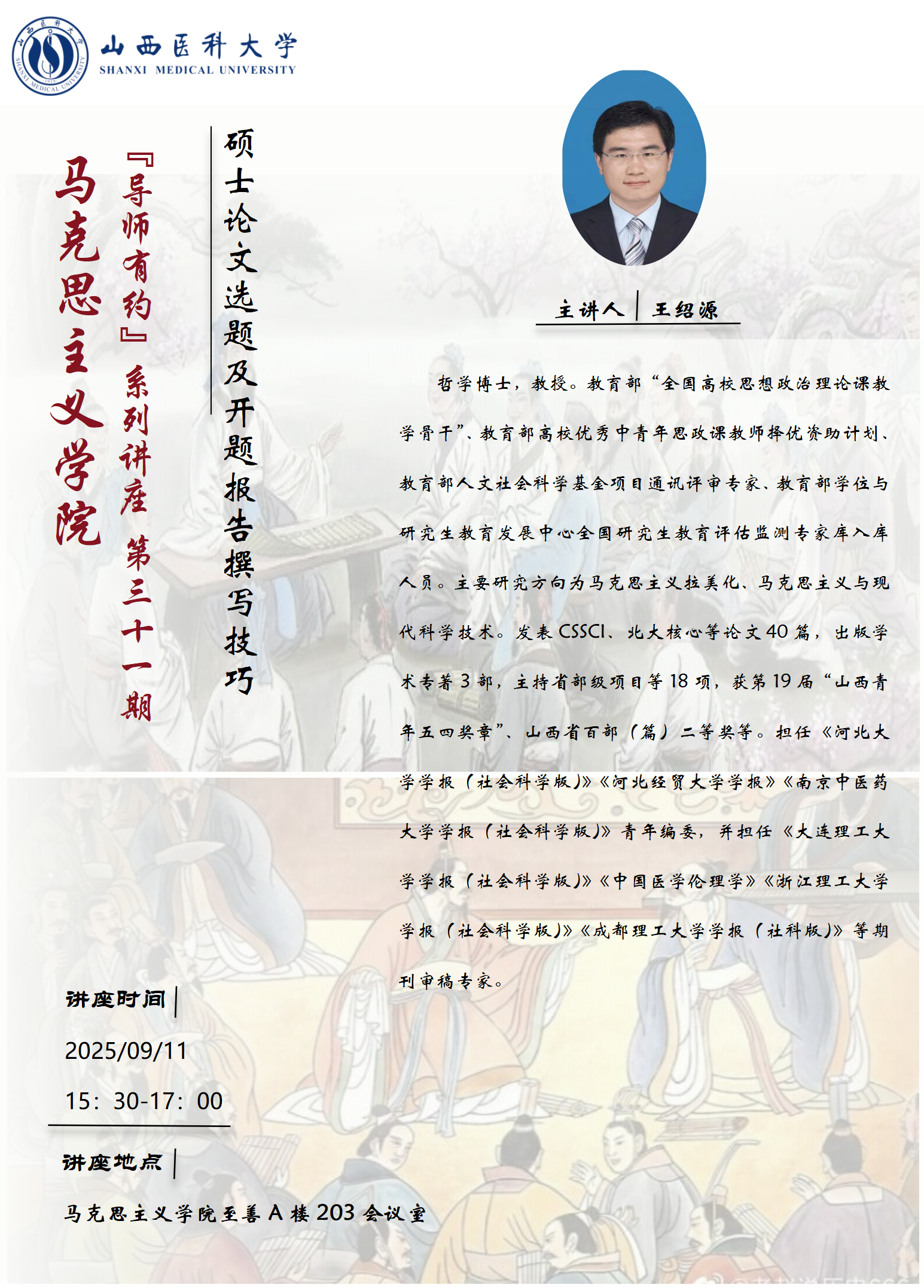 【“导师有约”第31期】王绍源讲“硕士论文选题及开题报告撰写技巧”