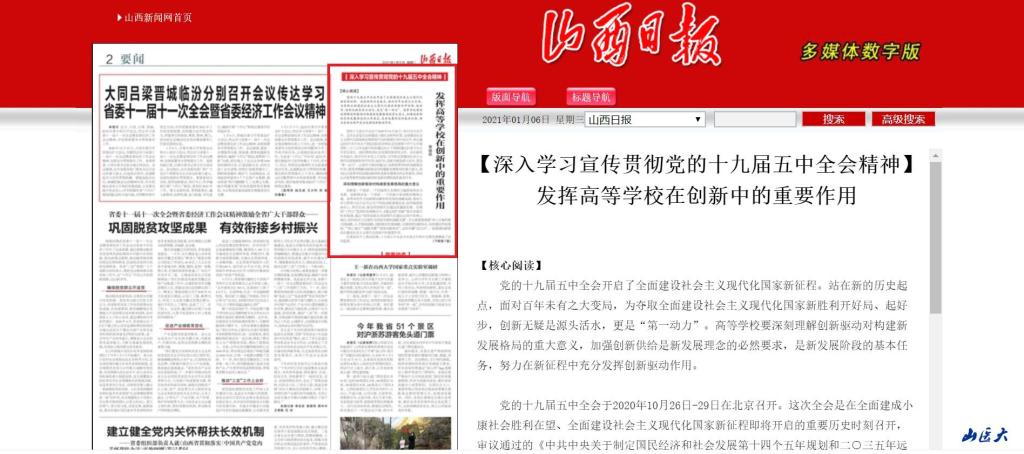 党的十九届五中全会开启了全面建设社会主义现代化国家新征程。站在新的历史起点,面对百年未有之大变局,为夺取全面建设社会主义现代化国家新胜利开好局、起好步,创新无疑是源头活水,更是“第一动力”。1月5日,校党委副书记贺培凤教授在《山西日报》要闻版刊发署名文章《发挥高等学校在创新中的重要作用》。文章认为,高等学校要深刻理解创新驱动对构建新发展格局的重大意义,加强创新供给是新发展理念的必然要求,是新发展阶段的基本任务,努力在新征程中充分发挥创新驱动作用。