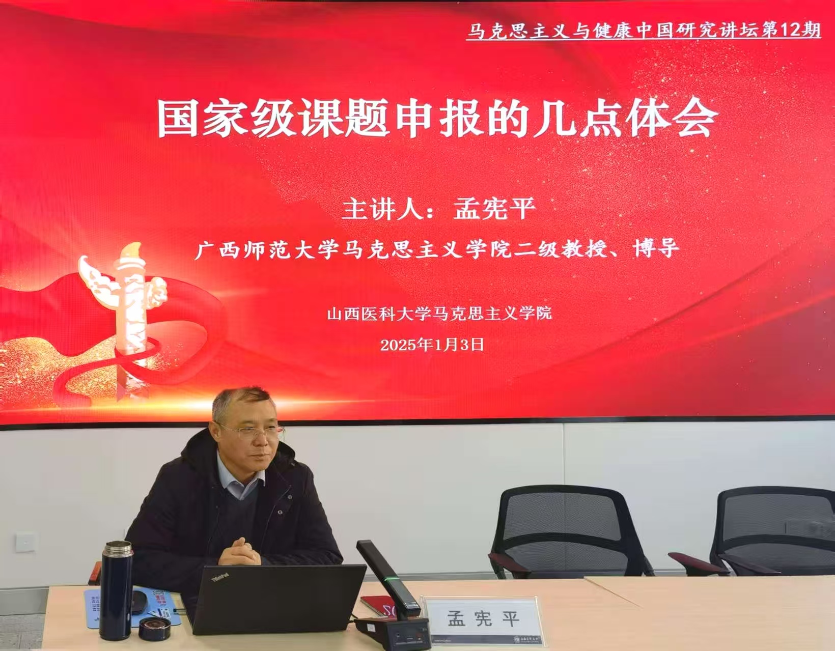 1月3号下午,“马克思主义与健康中国研究讲坛”第12期在至善A203室举行。本次讲座特别邀请了广西师范大学马克思主义学院的孟宪平教授,讲座主题为“国家级课题申报的几点体会”。