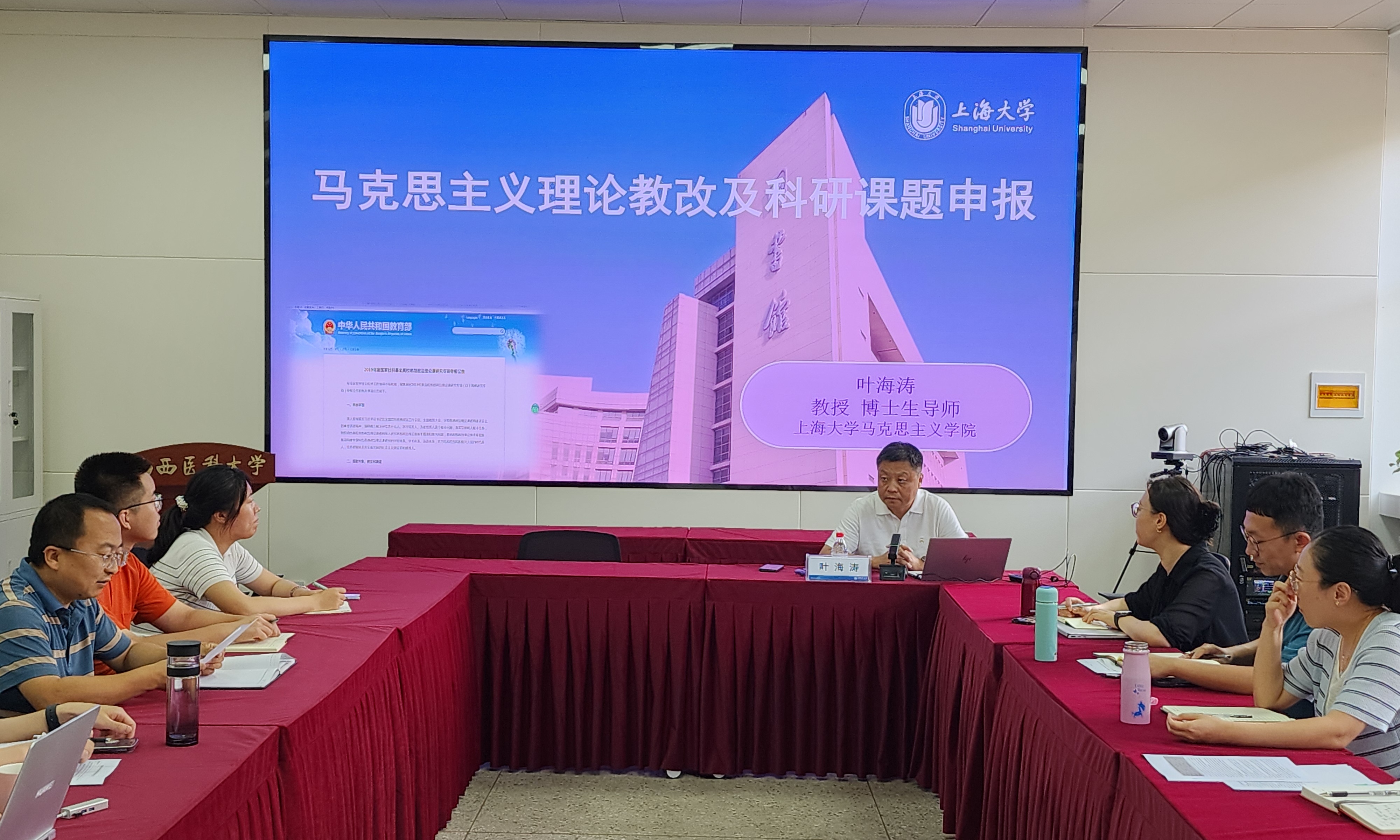 7月25日下午,“马克思主义与健康中国研究讲坛”第19期在至善楼A203室举行。本期讲座特邀上海大学马克思主义学院叶海涛教授作题为“马克思主义理论学科教改及科研项目申报辅导”的专题报告。讲座由万象城allwincity官网马克思主义学院王志新书记主持,学院全体教师及研究生代表30余人参加。