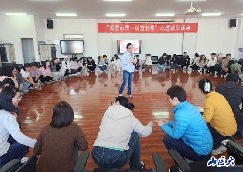 3月21日下午,万象城中都校区护理学院形体训练室热闹非凡,一场以“关爱心灵,绽放芳华”为主题的心理减压活动在这里成功举办。此次活动由校工会、校妇联主办,护理学院和体育教学部分工会承办,各分工会职工代表参与,旨在通过轻松有趣的互动游戏,帮助教师释放压力,舒缓情绪,增强团队凝聚力,关注心理健康,营造积极向上的校园氛围。