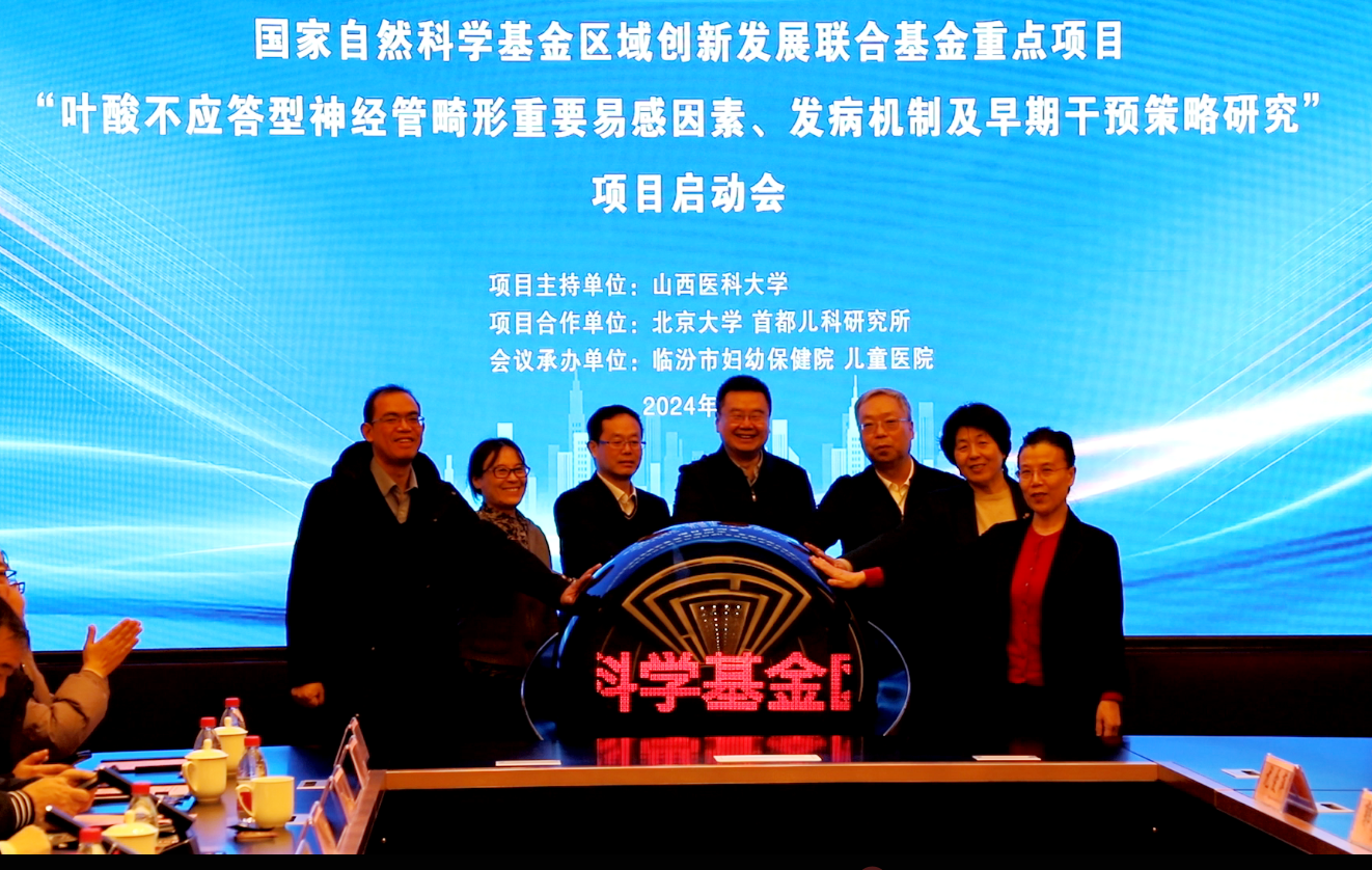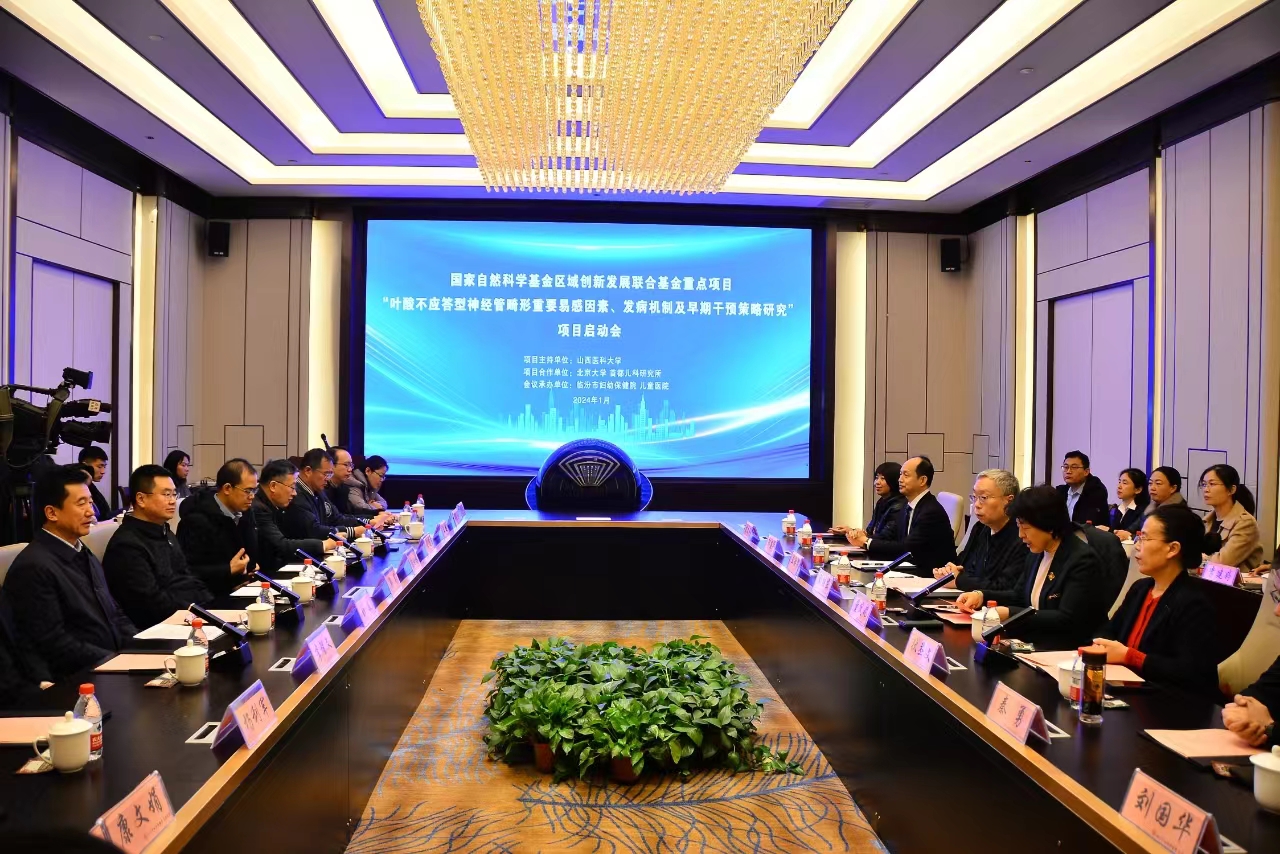 1月29日,国家自然科学基金区域创新发展联合基金重点项目“叶酸不应答型神经管畸形重要易感因素、发病机制及早期干预策略研究”在临汾市正式启动。该项目由万象城allwincity官网主持,联合北京大学、首都儿科研究所共同申报获批,旨在有效防范出生缺陷疾病发生风险、提高人口素质。本次启动会由临汾市妇幼保健院 儿童医院承办,山西省科技厅、万象城allwincity官网、北京大学生育健康研究所、首都儿科研究所、浙江大学、山西省儿童医院(妇幼保健院)的相关负责人和专家,以及临汾市政府办公室、市卫健委、市妇幼保健院等主要负责人参加会议。