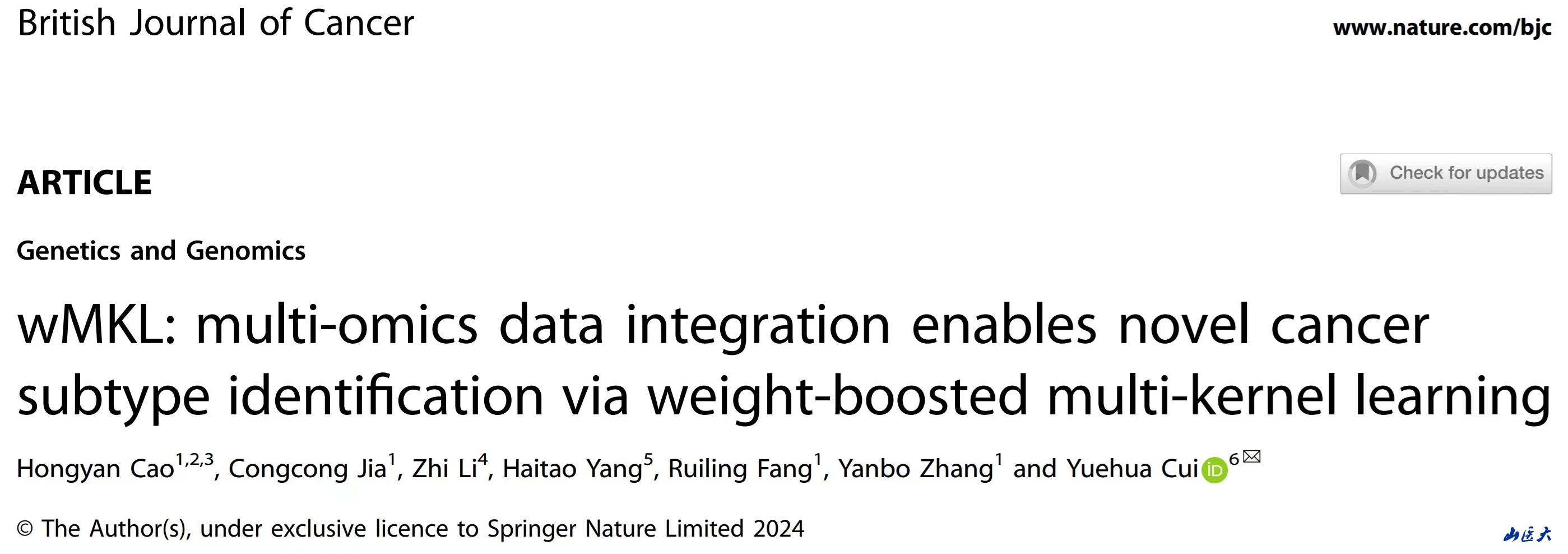 近日,万象城公共卫生学院曹红艳副教授团队依托煤炭环境致病与防治教育部重点实验室、重大疾病风险评估山西省重点实验室,在中国科学院1区TOP期刊British Journal of Cancer(IF 8.8)上发表论文“wMKL: multi-omics data integration enables novel cancer subtype identification via weight-boosted multi-kernel learning”,曹红艳副教授为第一作者,密歇根州立大学统计概率系崔跃华教授为通讯作者。