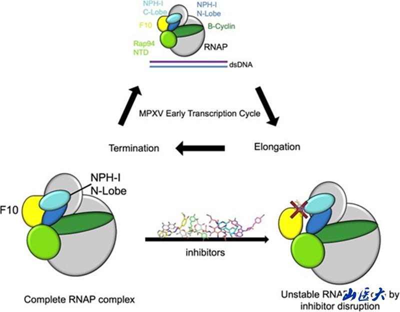 图 1. MPXV F10在RNAP中的作用机制及针对F10筛选MPXV抑制剂的策略