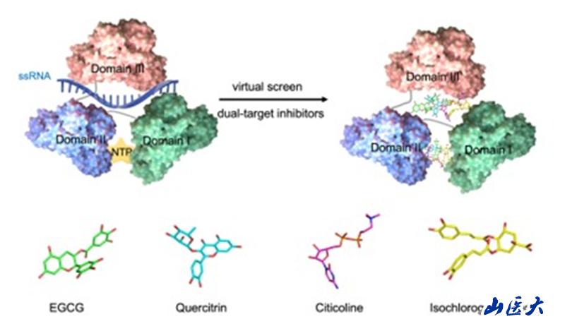 2. 巴加扎病毒(BAGV)解旋酶(helicase)的晶体结构解析及抑制剂筛选。BAGV是一种黄病毒,以蚊虫为传播媒介,不仅引起了严重的禽类死亡,人体感染后还会引起脑炎。BAGV基因组编码10种蛋白,包括3种结构蛋白和7种非结构蛋白。BAGV的NS3蛋白的C端在BAGV复制过程中起解旋酶的作用,利用ATP水解能量将病毒RNA双链解开以帮助病毒进一步复制。该工作解析了BAGV helicase的晶体结构,揭示了该helicase中的NTP和RNA结合口袋,可作为抗BAGV药物的靶点。基于该解旋酶的晶体结构,通过虚拟筛选,发现了20种同时靶向NTP结合位点和RNA结合位点的化合物。并通过分子对接、氨基酸突变分析、等温滴定量热法(ITC)和ATP酶活检测,发现EGCG、Quercitrin、Citicoline sodium及Isochlorogenic acid C对BAGV解旋酶的双靶点的亲和力高,并能明显抑制ATP酶的活性,因而这四种化合物可能是最有前景的BAGV抑制剂。该工作的亮点是发现了BAGV helicase的双靶点抑制剂,这为推进针对BAGV以及其他黄病毒的创新药物发现提供了新的策略。