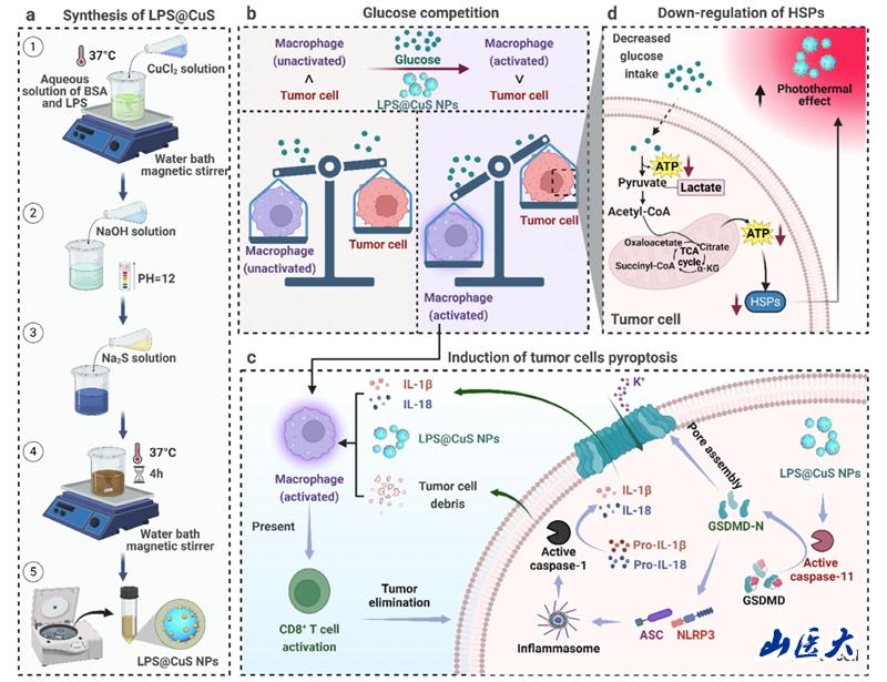肿瘤微环境中,肿瘤细胞与免疫细胞间的营养竞争异常激烈,肿瘤细胞通过代谢重编程掠夺葡萄糖资源,导致免疫细胞能量供给受限,严重削弱其抗肿瘤活性。此外,传统光热疗法虽可杀伤肿瘤,但肿瘤细胞可通过有效的营养摄取来上调热休克蛋白(HSPs)的表达,从而对热应激产生耐受性,降低光热治疗的敏感性。因此,研究团队创新性设计了一种半人工细菌焦亡诱导剂(SBP),用于逆转肿瘤微环境的代谢重编程。这种SBP基于硫化铜(CuS)和细菌细胞壁主要成分脂多糖(LPS)构建,通过仿生矿化获得具有类细菌免疫刺激特性与光热消融功能的纳米颗粒(LPS@CuS SBP),实现代谢干预与免疫激活的双重功能。