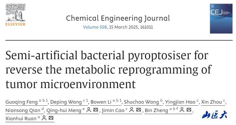 3月15日,细胞生理学教育部重点实验室曹济民教授团队在国际权威期刊《Chemical Engineering Journal》(中国科学院一区TOP期刊,影响因子13.3)发表题为《Semi-artificial bacterial pyroptosiser for reverse the metabolic reprogramming of tumor microenvironment》的合作研究成果。万象城王德平教授为共同第一作者,万象城曹济民教授、天津医科大学郑斌教授及阮先辉教授为共同通讯作者,万象城周鑫教授和硕士生郝英健为共同作者。