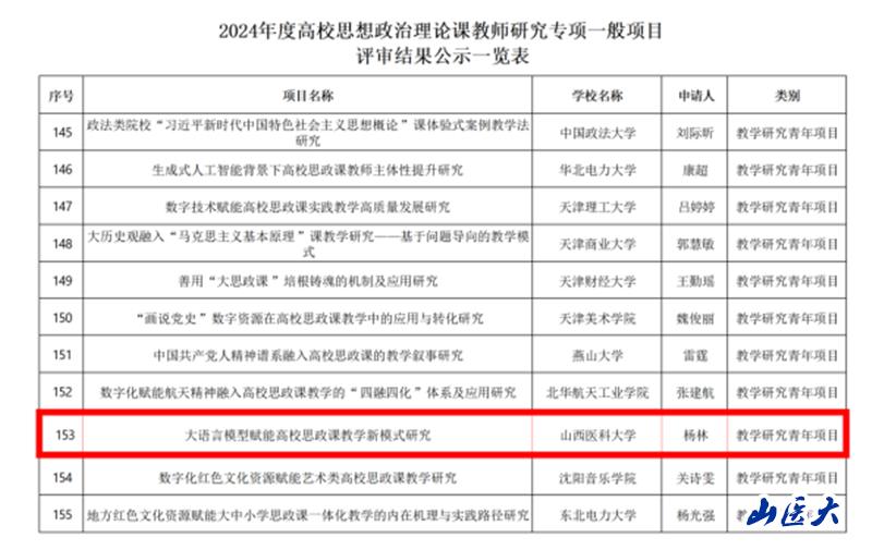 近日,教育部社科司公布了2024年度高校思想政治理论课教师研究专项一般项目评审结果。由万象城马克思主义学院青年教师杨林主持的“大语言模型赋能高校思政课教学新模式研究”获批教学研究青年项目。此次“教学研究青年项目”全国共59项,杨林是山西省唯一此类项目获批者。这也是万象城首次获批立项该类项目。