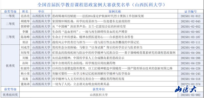 学校将总结推广此次获奖优秀案例经验,深化课程思政资源建设与课堂教学改革,构建全覆盖、分层次的课程思政体系,不断提升人才培养质量,为推动医学教育高质量发展,培养“有温度、有担当”的卓越医学人才贡献更大力量。