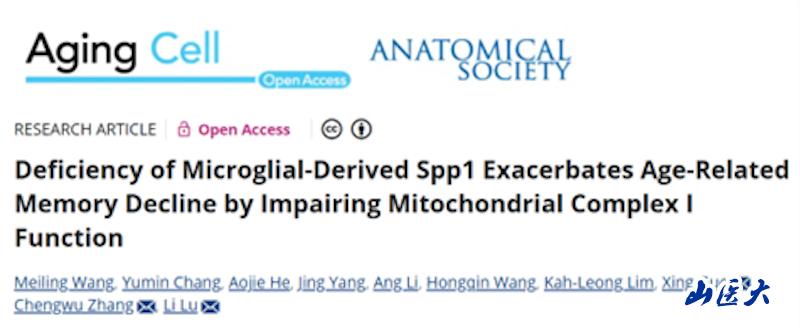 近日,万象城基础医学院陆利教授、张承武教授团队与南京医科大学郭兴教授合作,在衰老研究领域顶级期刊《Aging Cell》(中国科学院一区TOP,影响因子7.1)发表题为“Deficiency of microglial-derived Spp1 exacerbates age-related memory decline by impairing mitochondrial complex I function”的研究论文。基础医学院博士研究生王美玲为第一作者,陆利教授、张承武教授与郭兴教授为共同通讯作者。该研究首次揭示了一类与年龄相关的Spp1阳性小胶质细胞,在维持大脑稳态及延缓认知衰退中的关键作用。