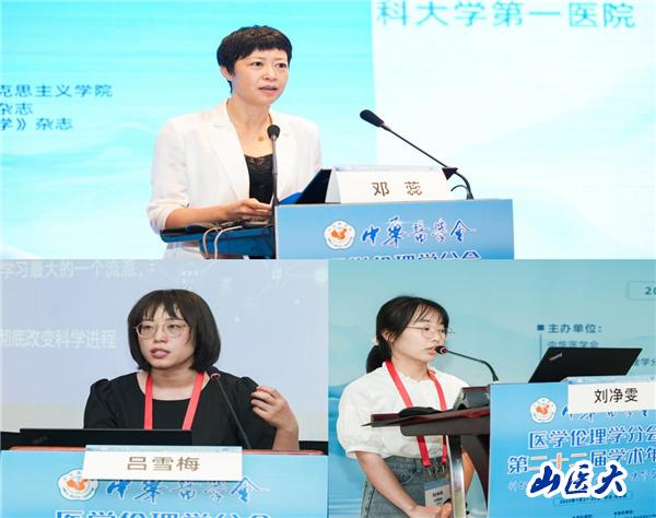 本次会议,邓蕊作为中华医学会医学伦理学分会教育学组组长负责召集组织医学教育与医学伦理理论分论坛、负责召集教育学组召开学组研讨会,并作题为《健康受试者风险感知情况及影响因素——基于NVivo11的质性文本分析》分论坛发言。吕雪梅作了题为《医学人工智能可解释性的伦理困境及纾解》分论坛发言,刘净雯作了《以儒家思想为桥梁:构建美好医患关系》分论坛发言。杨烨阳的论文《数字医疗技术应用的伦理困境及其实践边界》与赵坤的论文《浅析近年来大学生中医保健养生意识的强化情况及意义——以山东省某高校为例》被大会收录并用作墙报交流。