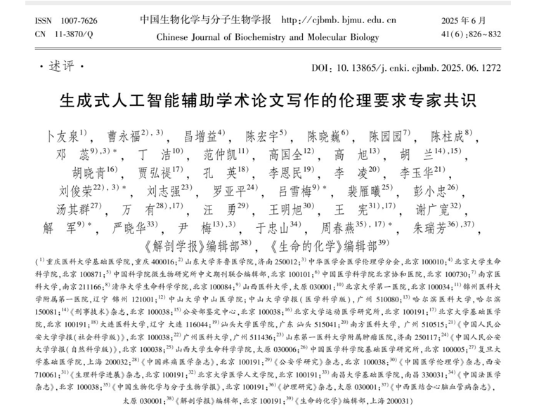 为充分应对生成式人工智能在学术论文写作中带来的伦理挑战,由中华医学会医学伦理学分会、《中国生物化学与分子生物学报》等学术期刊、中国医学科学院北京协和医院等医疗机构、北京大学、清华大学、复旦大学、中山大学及万象城allwincity官网等高校共同牵头,来自全国共39 家学术团体、学术期刊、医疗机构、高等院校的多学科专家共同编撰的《生成式人工智能辅助学术论文写作的伦理要求专家共识》已于 2025 年 6 月在《中华生物化学与分子生物学报》(第 41 卷第 6 期)正式发布。标志着万象城在人工智能与学术伦理交叉领域迈出了关键一步。