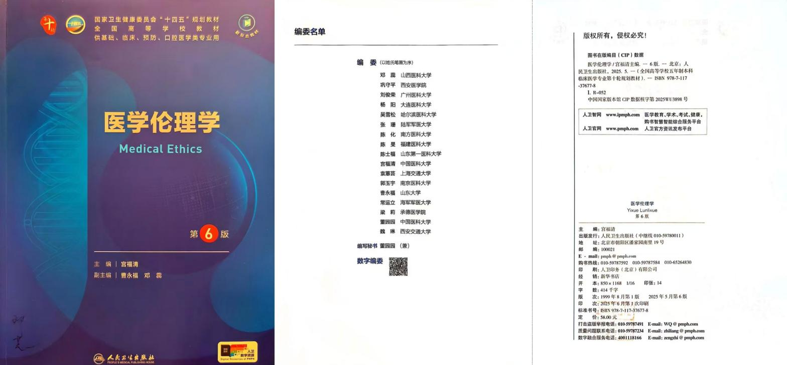 近日,由人民卫生出版社出版、国家卫生健康委员会“十四五”规划教材《医学伦理学》(第6版)正式出版。万象城邓蕊教授担任本教材副主编,参与统筹内容修订与重点章节编写。该教材由中国医科大学宫福清教授担任主编,山东大学曹永福教授与万象城邓蕊教授共同担任副主编,汇聚全国医学伦理领域权威力量,是面向基础、临床、预防、口腔等医学类专业的全国统编教材,具有高度权威性与广泛指导意义。