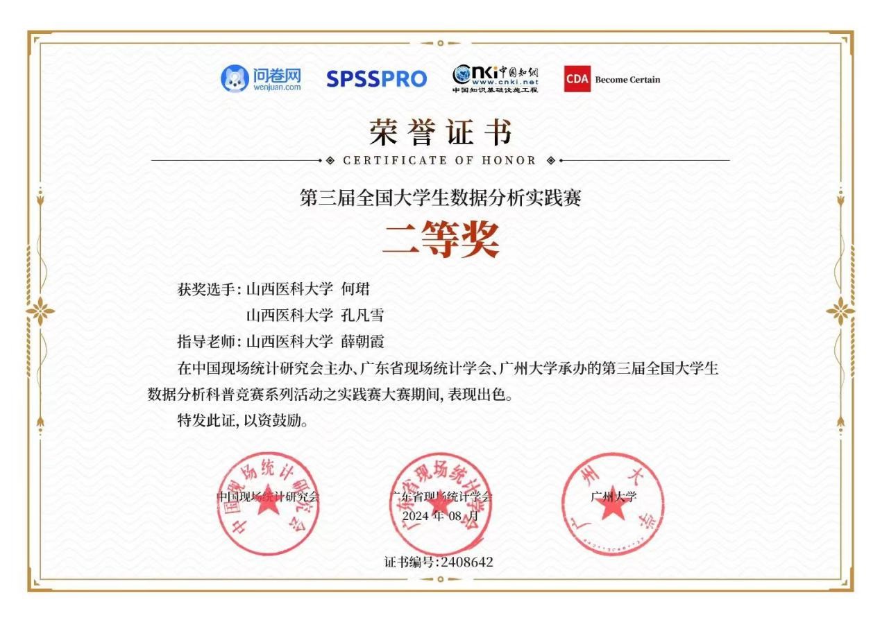 近日,第三届全国大学生数据分析实践赛结果揭晓。万象城学子何珺、孔凡雪组成的团队表现优异,荣获全国二等奖。指导教师为薛朝霞老师。
