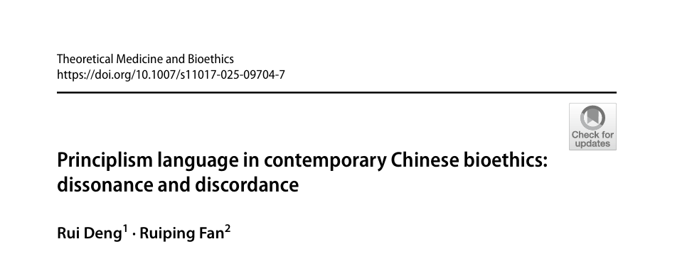 近日,邓蕊教授与香港城市大学范瑞平教授于2025年2月12日在SSCI期刊《Theoretical Medicine and Bioethics》发表了题为“Principlism language in contemporary Chinese bioethics: dissonance and discordance”(当代中国生命伦理学中的原则主义语言)的论文。