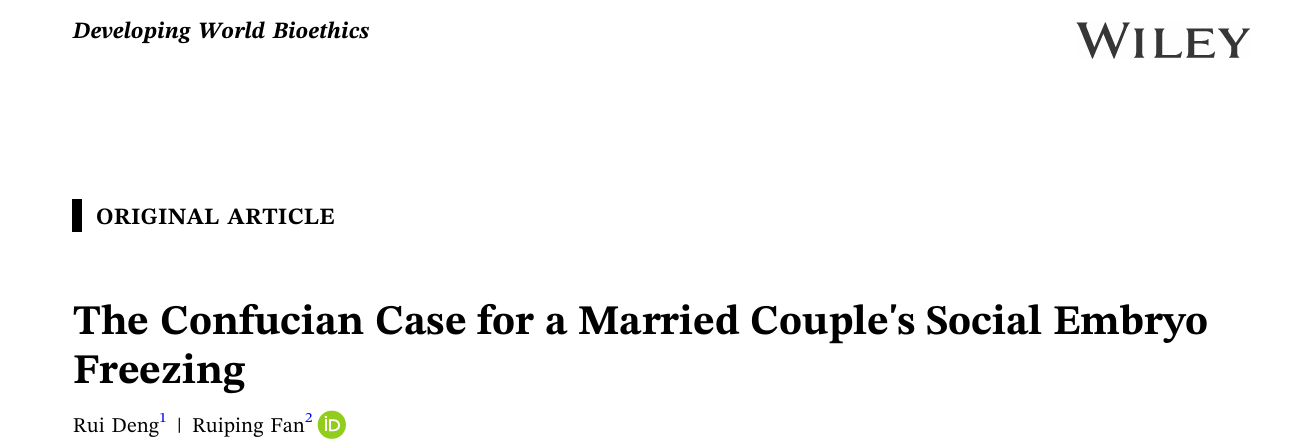 近日,邓蕊教授与香港城市大学范瑞平教授共同撰写的文章“The Confucian Case for a Married Couple's Social Embryo Freezing”(已婚夫妇社会性冷冻胚胎的儒家伦理分析)于2025年7月24日发表在SSCI期刊《Developing World Bioethics》上。