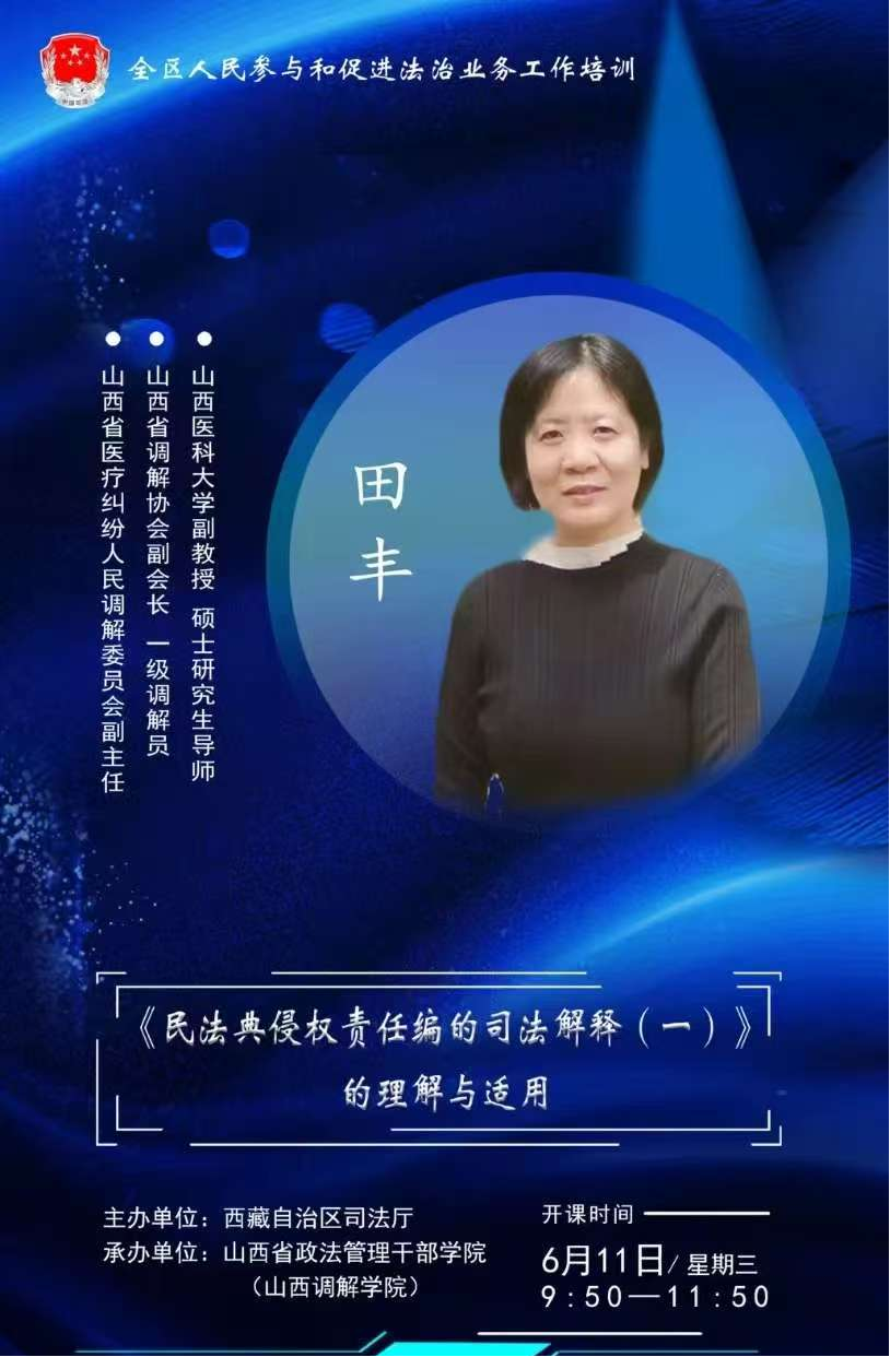 2025年度人民参与和促进法治第七期线上培训于6月开课,此次授课内容为《民法典侵权责任编的司法解释(一)的理解与适用》,为有效避免责任认定的模糊不清和诉讼程序的混乱无序,我院副教授、硕士研究生导师、山西省调解协会副会长、一级调解员、山西省医疗纠纷人民调解委员会副主任田丰老师应邀为我省和西藏地区司法行政干部和广大调解员授课,共同提升法治素养和调解能力。