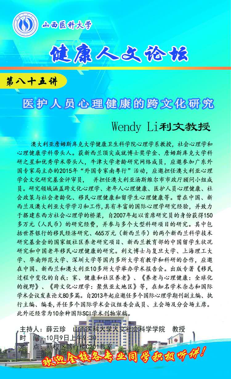 健康人文论坛第八十五讲“医护人员心理健康的跨文化研究”