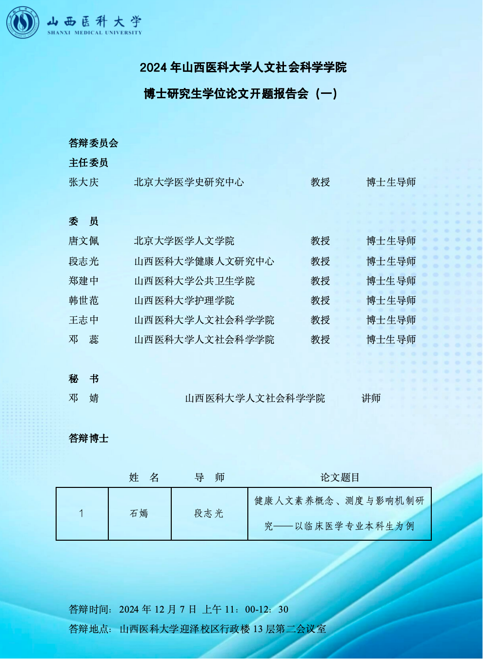 2024年人文医学博士研究生学位论文开题报告会(一)