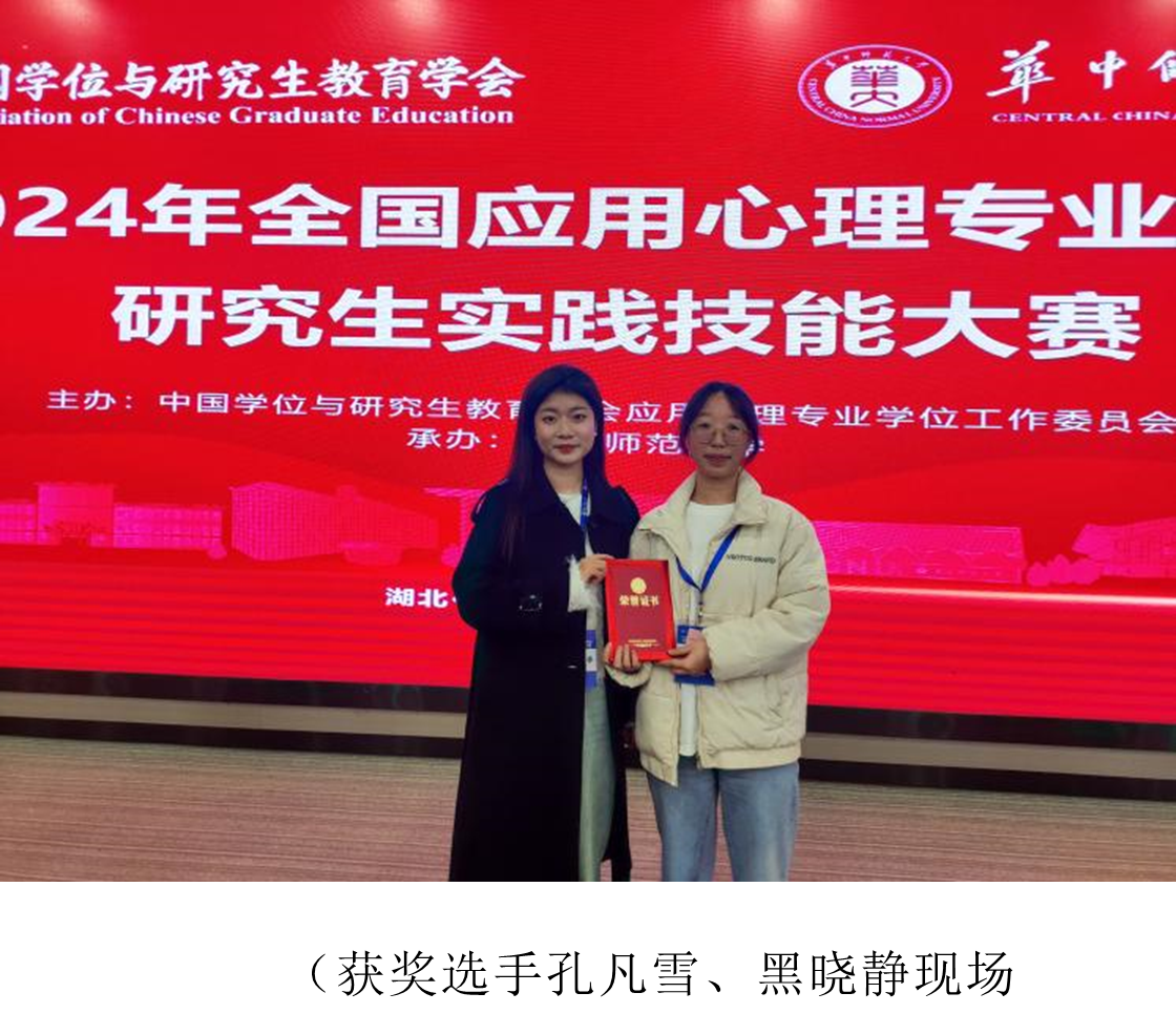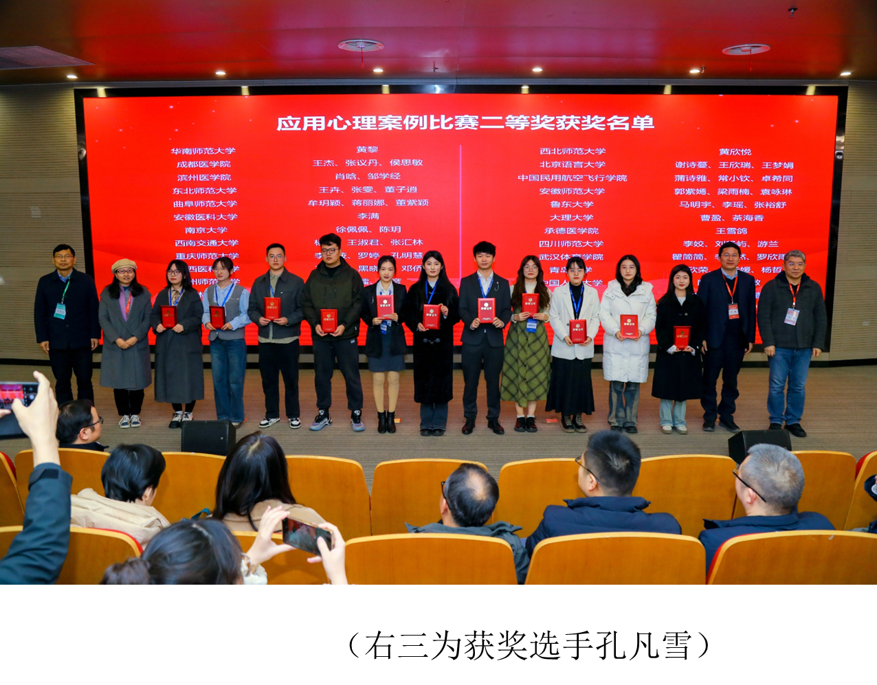 在本次竞赛中,我院选手们凭借扎实的准备和出色的表现,斩获了丰硕成果,分别获得二等奖一项和三等奖两项。这些荣誉不仅充分体现了我院优秀的培养体系,也展示了心理学子的卓越风采。具体获奖情况如下:应用心理专业硕士研究生孔凡雪、黑晓静、邓侨(指导教师:周旻)荣获应用心理案例比赛二等奖;郭丽(指导教师:张亚亚)荣获心理面谈比赛三等奖;童诗羽、李辛影、龙文清(指导教师:田峰)荣获心理科普作品比赛三等奖。