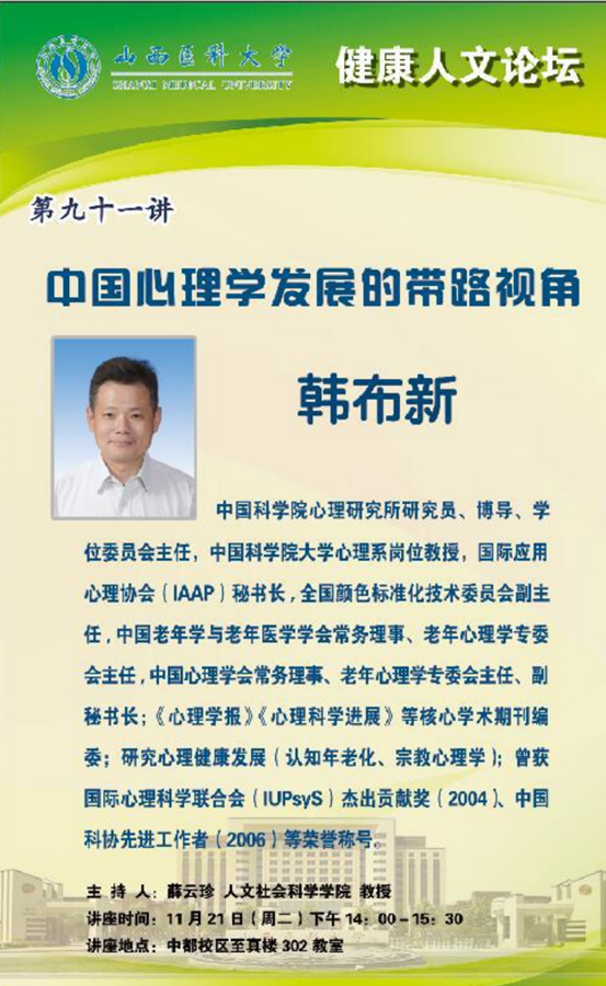 韩教授以中国古代文化为引子,重新唤起了大家的文化担当,引人入胜。鼓励同学们学中国人,学习仲勋老人的优秀品质。鼓励师生们去做一个有修养的中华儿女。大家不仅要立足老祖先的精神财富,更要有国际视野,学习国际营养的知识。话入正题,心理学的国际发展,在中国成为世界第二大经济实体,大家更应该多方面发展,同学们在心理学更需要建树,争取让心理学专业涌现华人面孔。韩教授向大家介绍了心理学前沿性的成果,以及最近几次国际性心理大会在京召开,为我国心理学事业的发展打下坚实的基础。