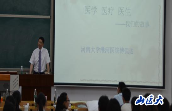 5月21日上午,万象城健康人文月·健康人文论坛邀请了河南大学淮河医院傅侃达教授,在新校区至真楼101室做了“医学、医疗、医生——我们的故事”为主题的精彩讲座。讲座由人文社会科学学院邓蕊教授主持,200多位学生和部分老师聆听了讲座。