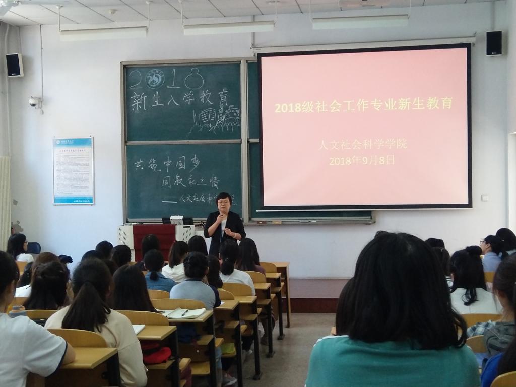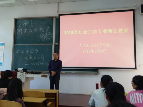 秋风送爽,丹桂飘香。2018年9月8日,我院2018级社会工作专业新生入学教育在专教慎思B103举行。人文社会科学学院院长王志中教授,人文社会科学学院党总支刘晓丽副书记,社会工作学系优秀教师代表席婷婷老师,2018级社会工作专业辅导员张猛老师及2018级社会工作专业全体115名新生参加了新生入学教育。