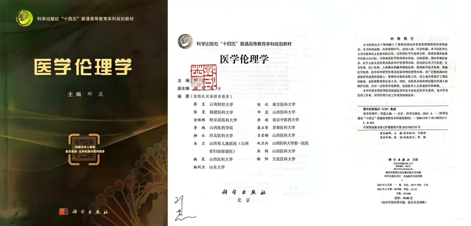 我院邓蕊教授主编科学出版社 “十四五”普通高等教育本科规划教材《医学伦理学》正式出版